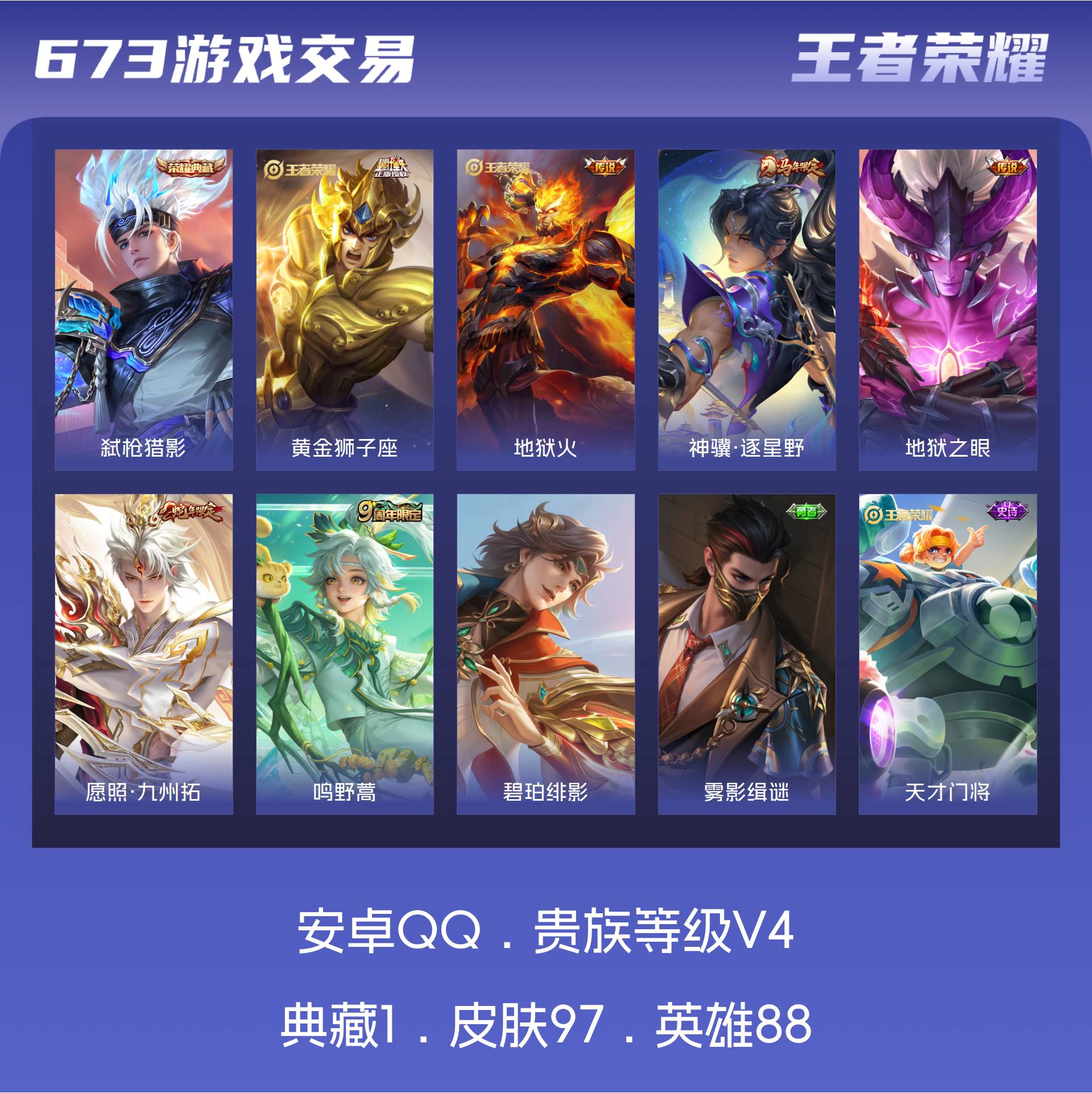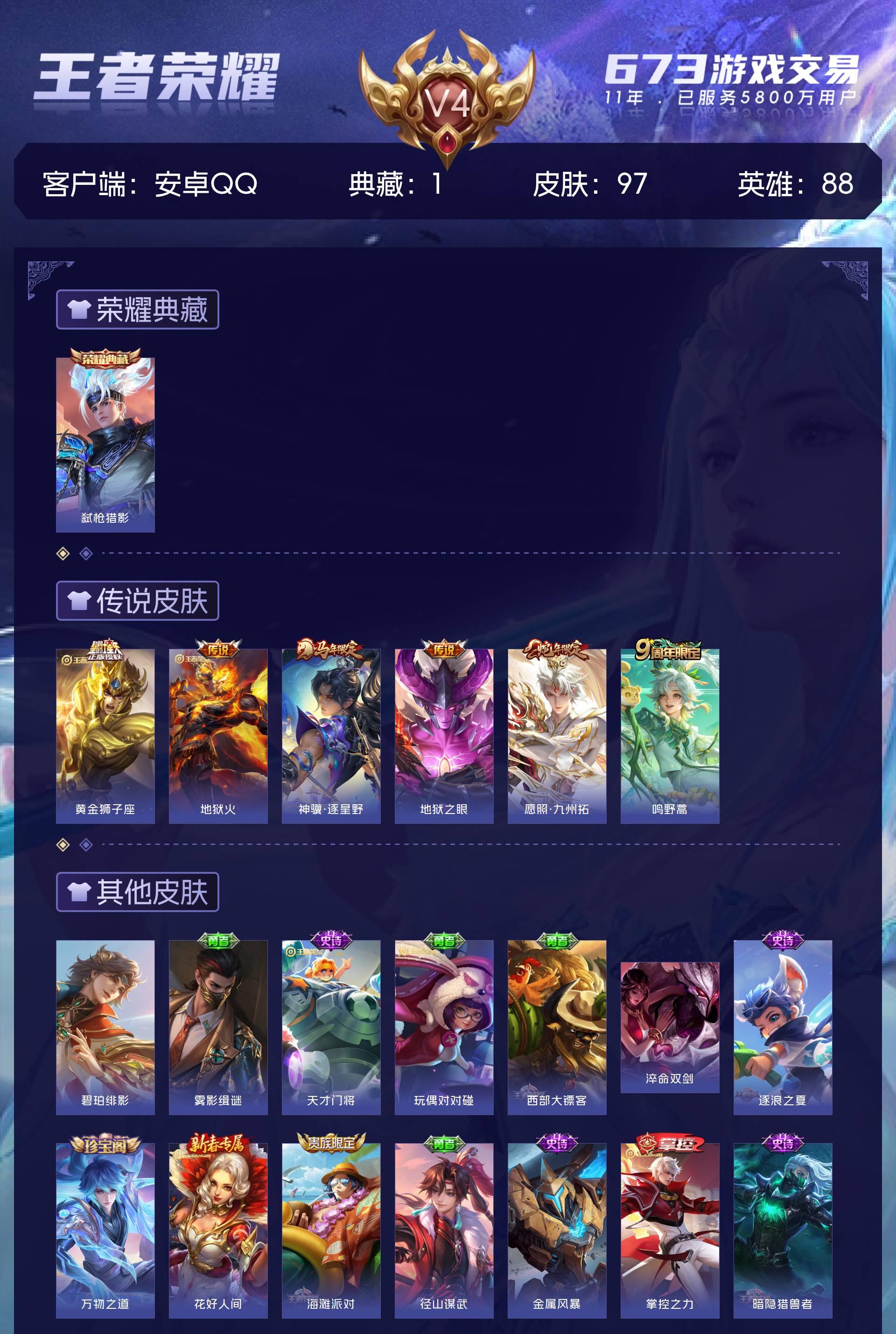 V4 皮肤97 英雄88 至尊星耀 荣耀典藏1 星传说1 传说6