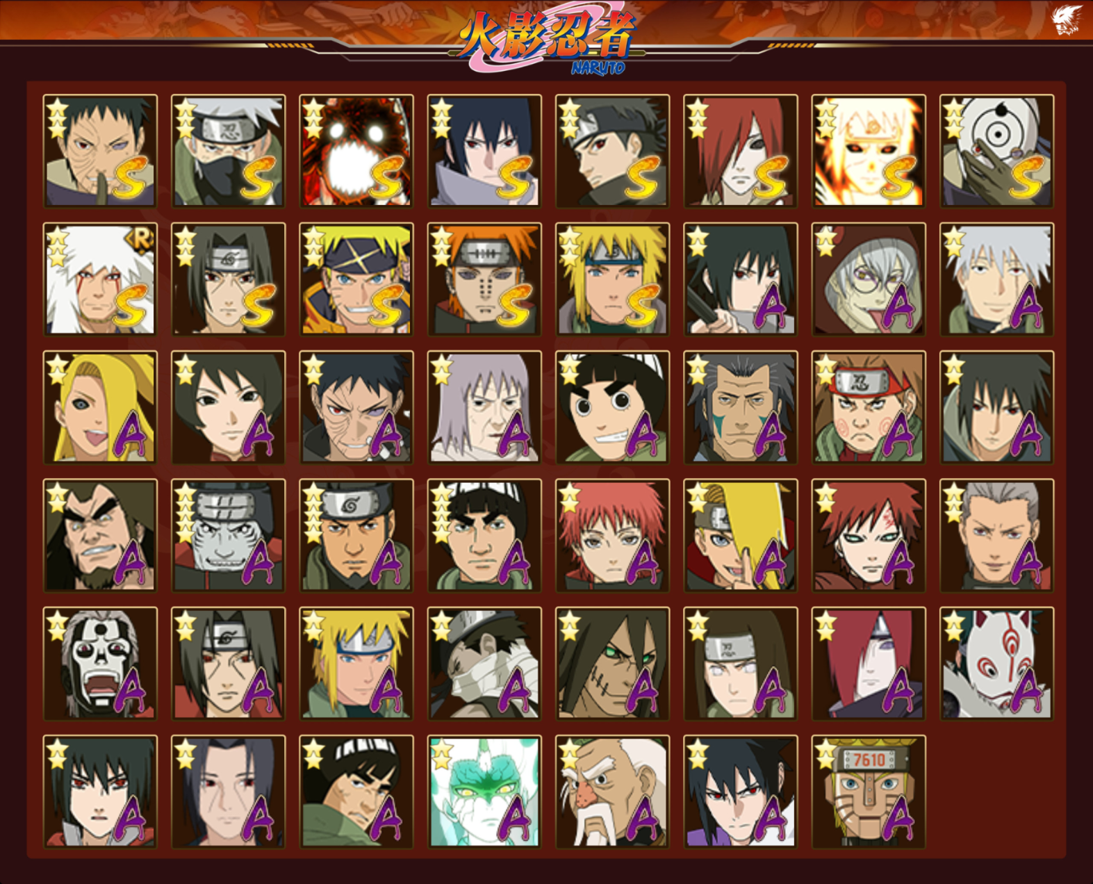 【S级忍者】宇智波带土「忍界大战」(3星),旗木卡卡西「须佐能乎」(3星),漩涡鸣人「暴怒·第六尾」(3星),宇智波佐助「永恒万花筒」(3星),宇智波止水「须佐能乎」(3星),长门「秽土转生」(3星),波风水门「九喇嘛连结」(3星),宇智波斑「白面具」(3星),自来也「舞之豪杰」(3星),宇智波鼬「须佐能乎」(3星),漩涡
