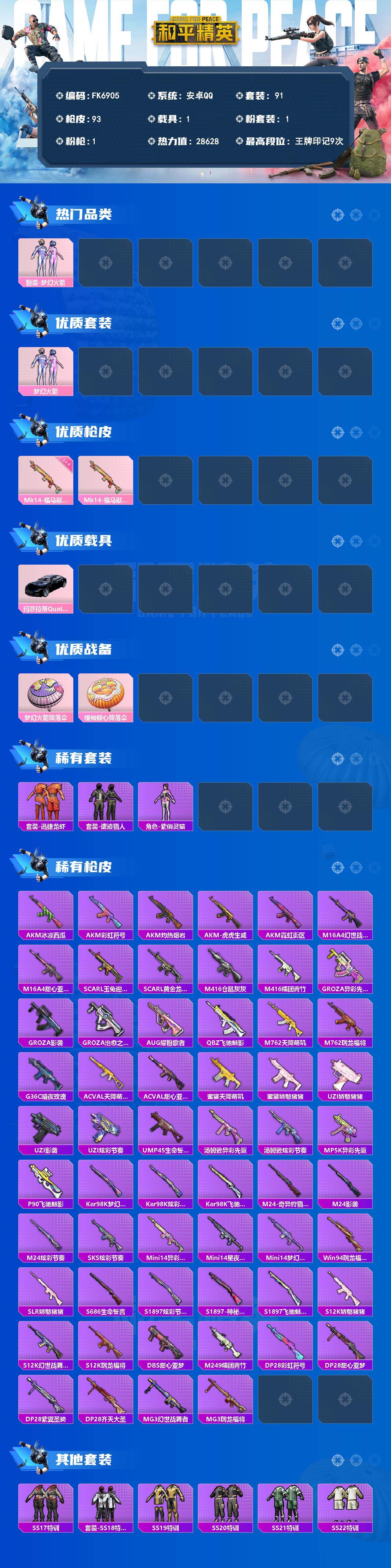 【FK6905】91套装/枪械1/装备95/载具1/战备90/王牌印记9/热力值28628/四级Mk14-福马献瑞/粉装-梦幻火箭/梦幻火箭/玛莎拉蒂Quattroporte(夜幕蓝)/Mk14-福马献瑞/梦幻火箭降落伞/橘柚倾心降落伞/套装-雪国风尚/套装-迅捷龙虾/套装-遗迹猎人/角色-紫俏灵猫/AKM-冰凉西瓜/AKM-彩虹符号/AKM-灼热熔岩/AKM-虎虎生威/AKM-霓虹街区/M16