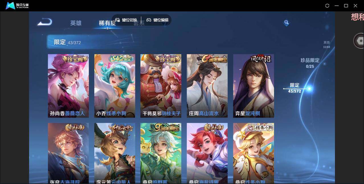 【限定皮肤】:蒙犽顽岩魄,大乔绒语心约,姜子牙天穹之誓,狄仁杰阴阳师,孙尚香蔷薇恋人,庄周高山流水,