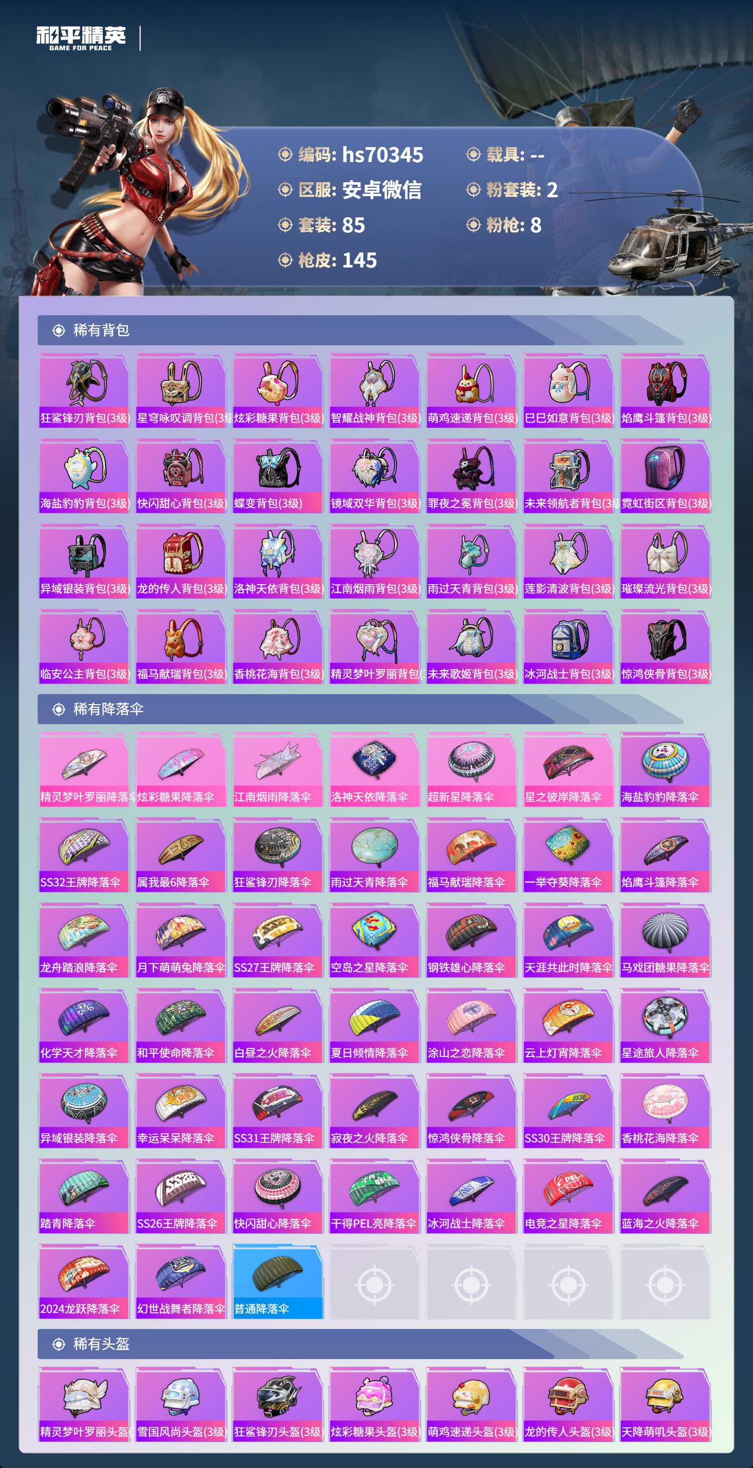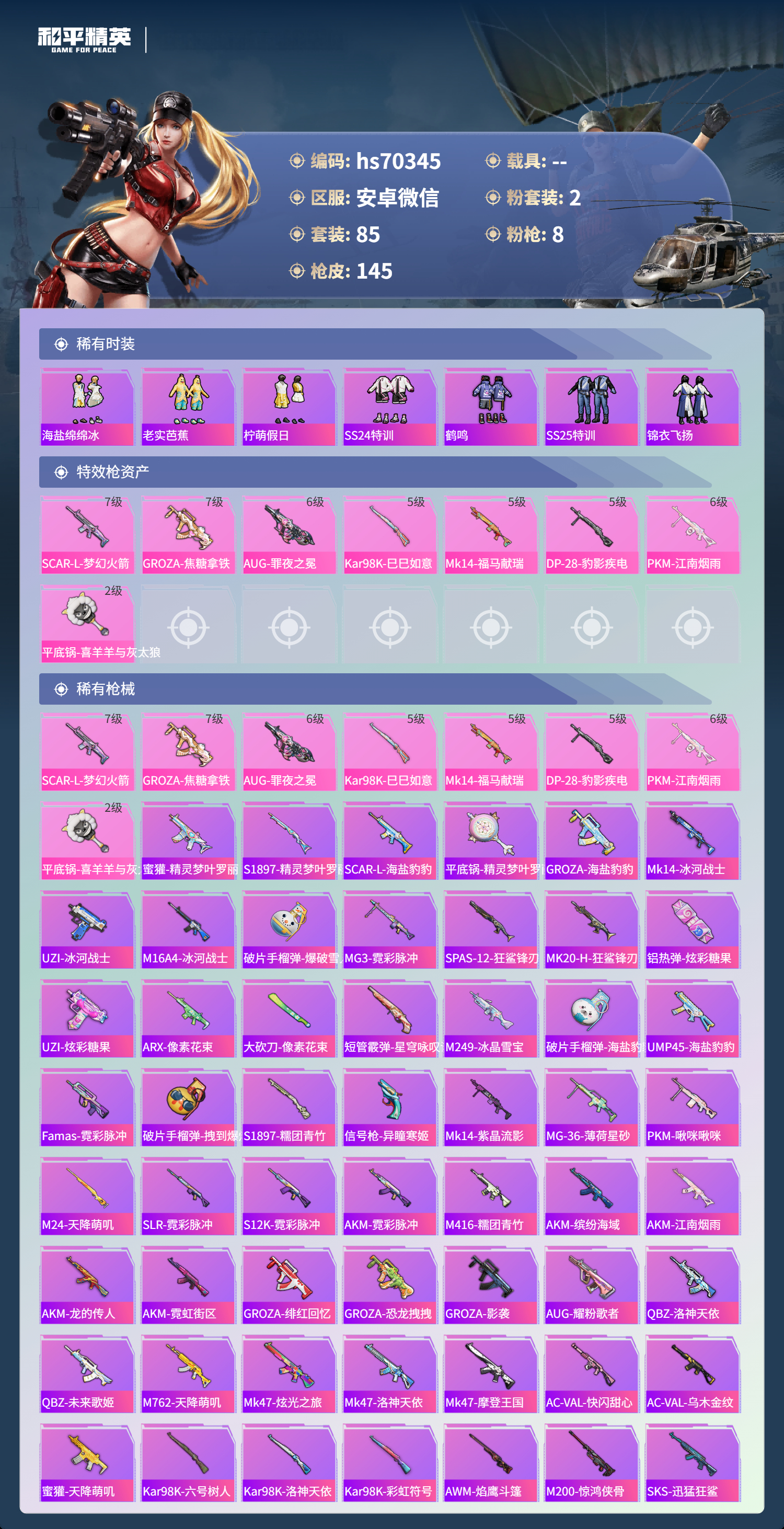 hs70345 安卓微信-8王牌印记-2粉装-8特效枪-41526热力值-85套装-145枪皮-2卓越印记
