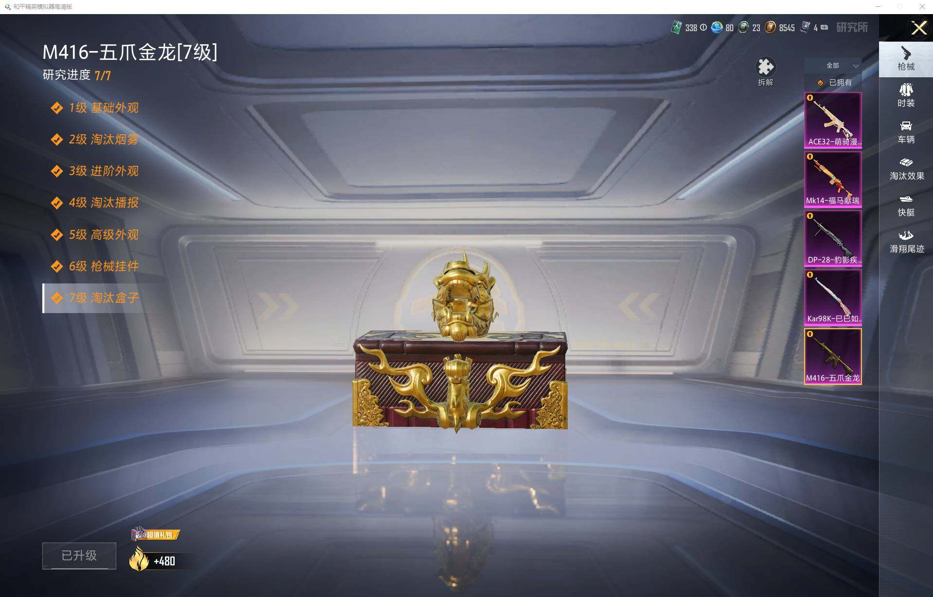 【粉色枪皮等级】:M416-五爪金龙(七级),ACE32-萌骑漫游(四级),Kar98K-巳巳如意(五级),Mk14-福马献瑞(一级),DP-28-豹影疾电(五级)