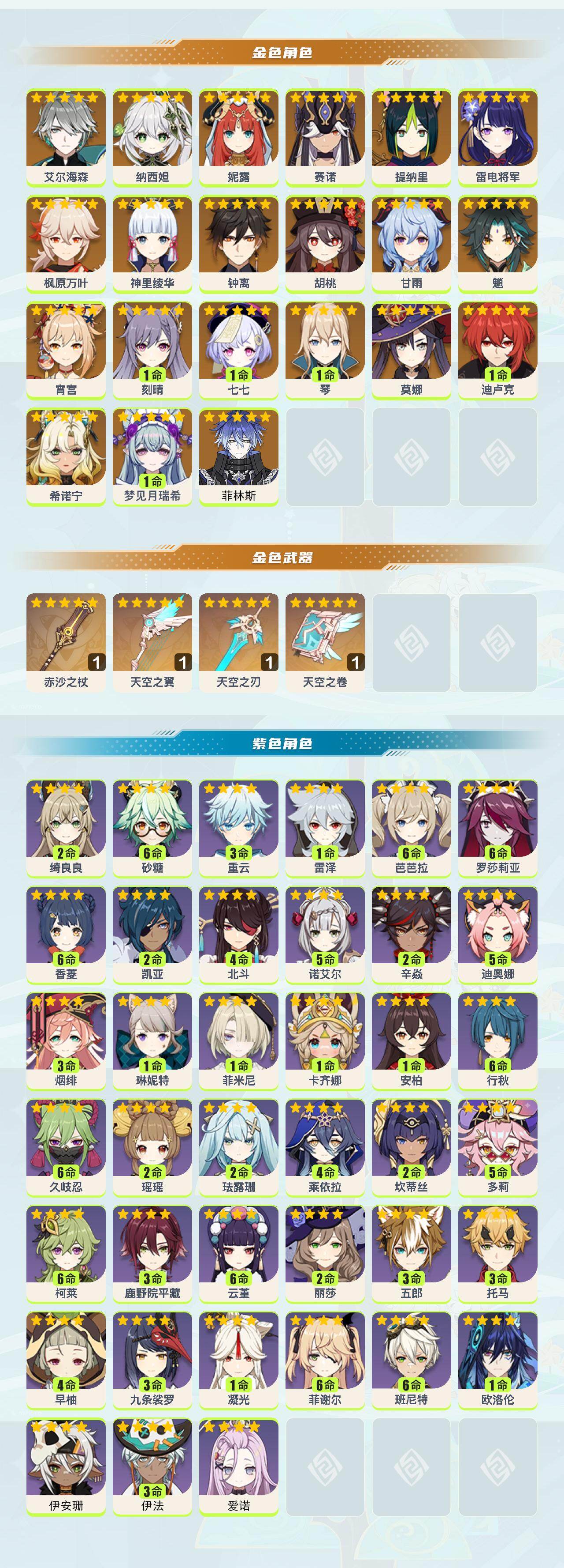 【YSZ3272】58级/女主/22个五星角色/0命菲林斯/1命梦见月瑞希/希诺宁/艾尔海森/纳西妲/妮露/赛诺/提纳里/雷电将军/宵宫/神里绫华/枫原万叶/胡桃/魈/甘雨/钟离/1命琴/1命刻晴/1命迪卢克/莫娜/1命七七/赤沙之杖/天空之卷/天空之刃/天空之翼/0命爱诺/3命伊法/0命伊安珊/0命欧洛伦/卡齐娜/菲米尼/琳妮特/2命绮良良/2命瑶瑶/2命珐露珊/4命莱依拉/2命坎蒂丝/5命多莉/满命柯莱/3命鹿野院平藏/满命久岐忍/满命云堇/3命五郎/3命托马/3命九条裟罗/4命早柚/3命烟