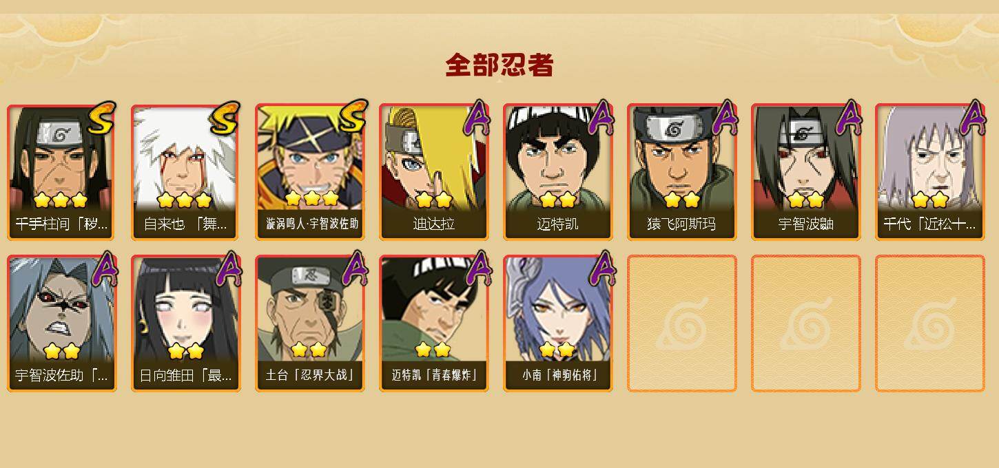 【HYYT496】VIP等级V1/战力193W/S忍数量3/A忍数量10/舞之豪杰-自来也/宇智波鼬/迈特凯/疾风传咒印-宇智波佐助/2星小南「神驹佑将」/最终章-日向雏田/3星漩涡鸣人·宇智波佐助/猿飞阿斯玛/迪达拉/2星迈特凯「青春爆炸」/秽土转生-千手柱间/2星土台「忍界大战」/近松十人卫-千代