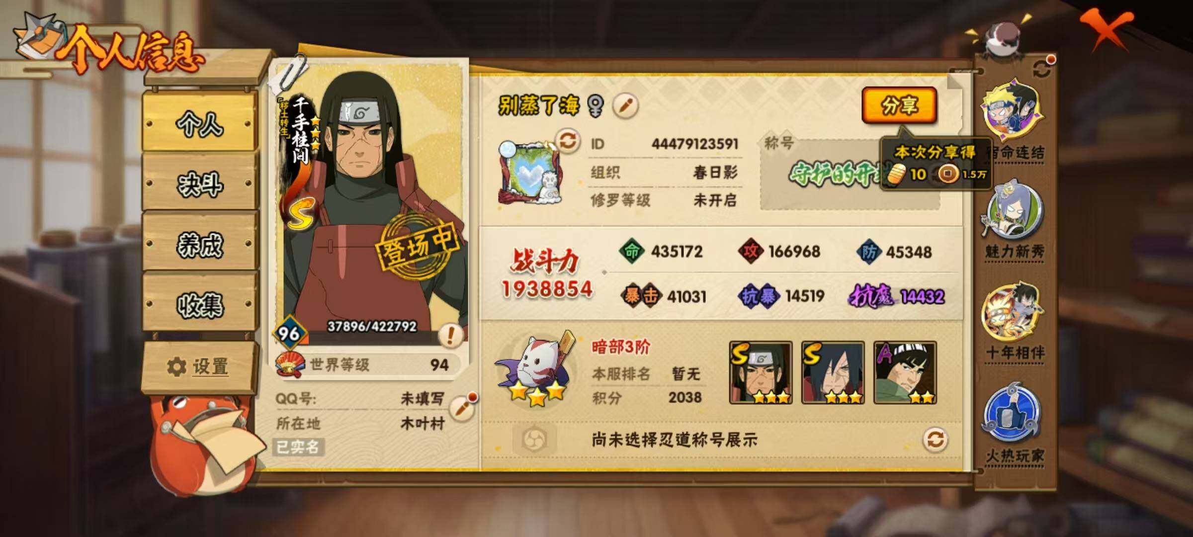VIP等级V1/战力193W/S忍数量3/A忍数量10/