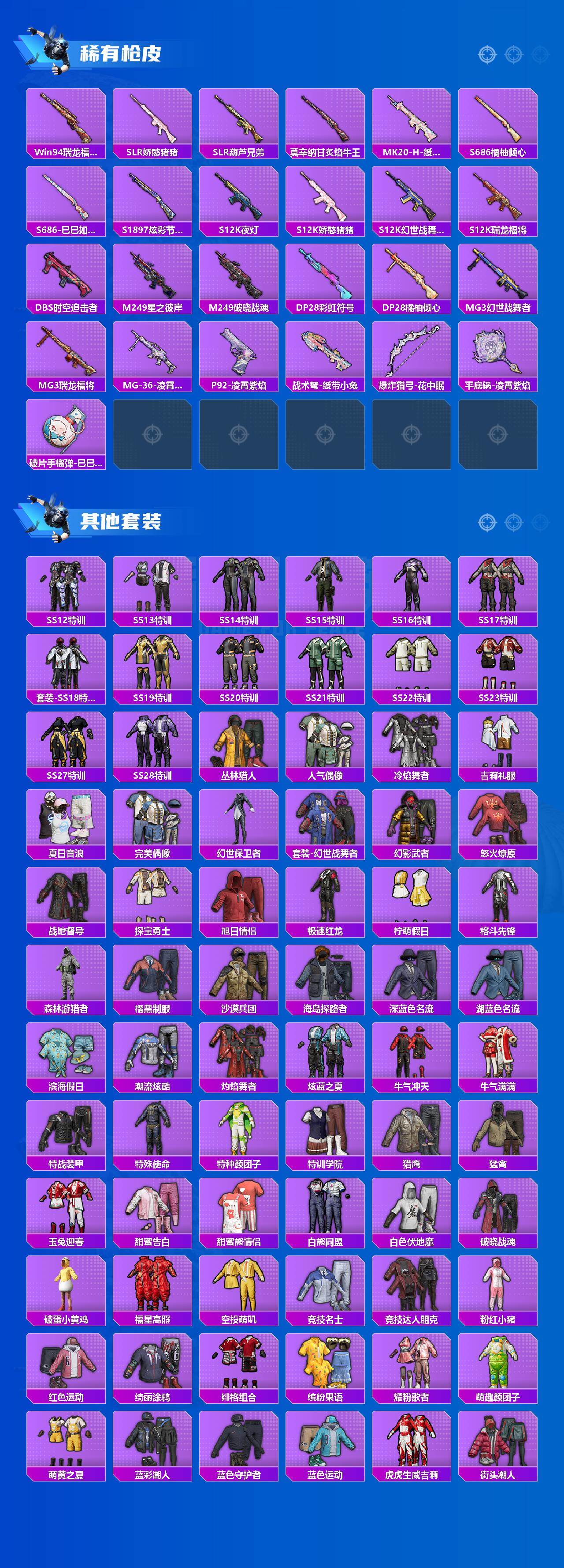【粉色枪皮】:蜜獾-荧海星豚,Kar98K-巳巳如意,Mk14-福马献瑞,DP-28-豹影疾电,PKM-萌骑夺宝