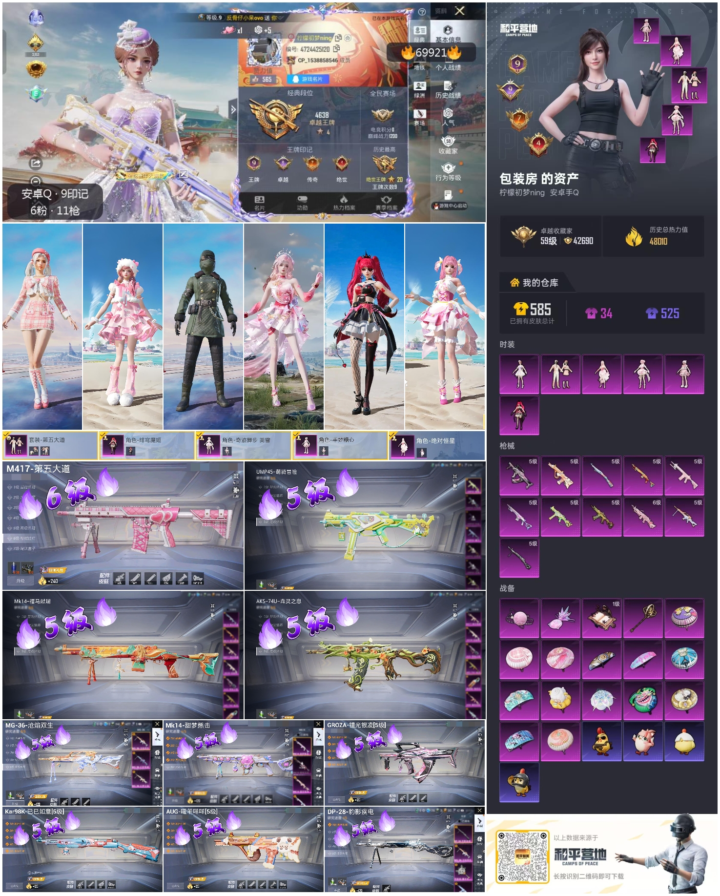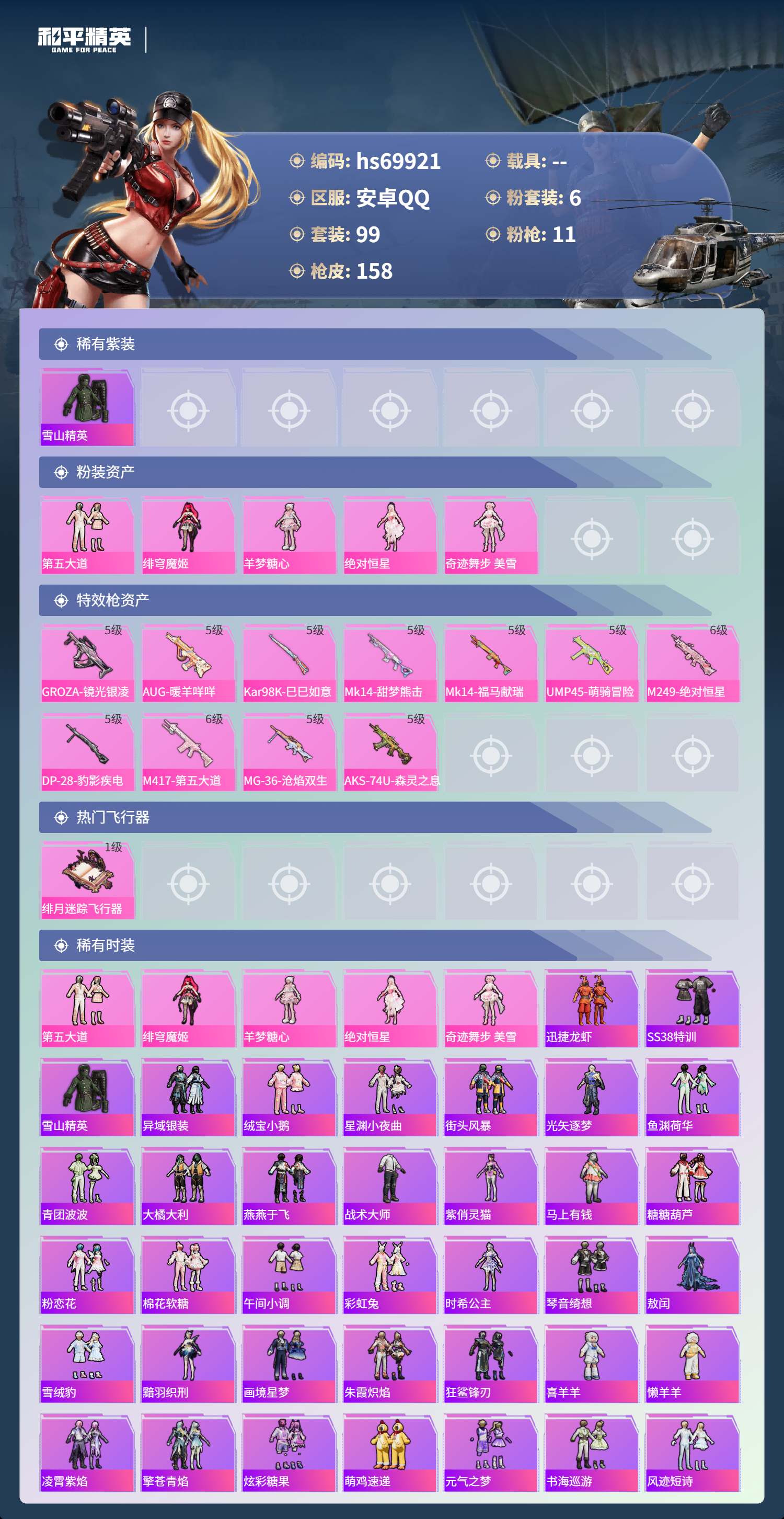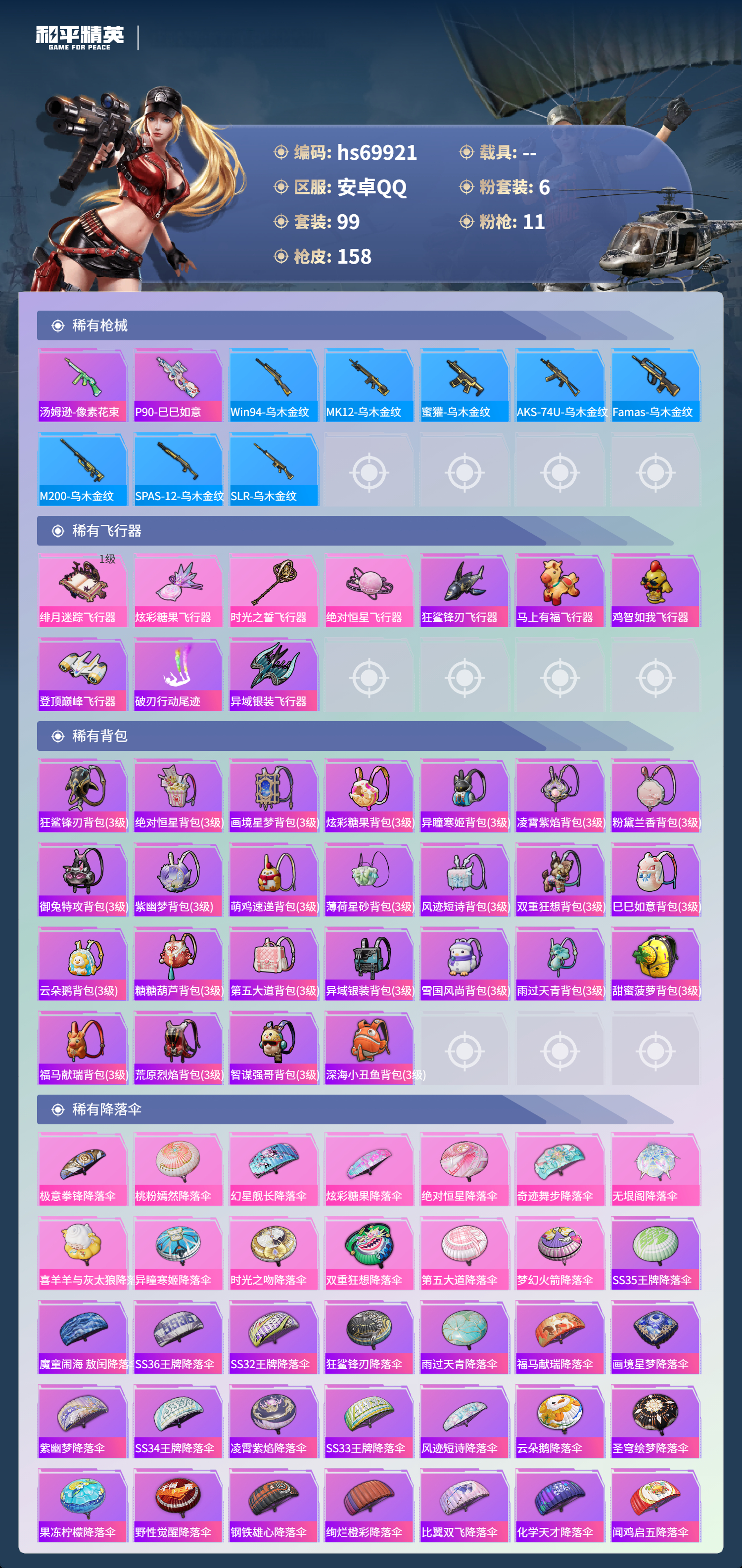 hs69921 安卓手Q-9王牌印记-6粉装-11特效枪-48525热力值-99套装-158枪皮-9卓越印记-7传奇印记