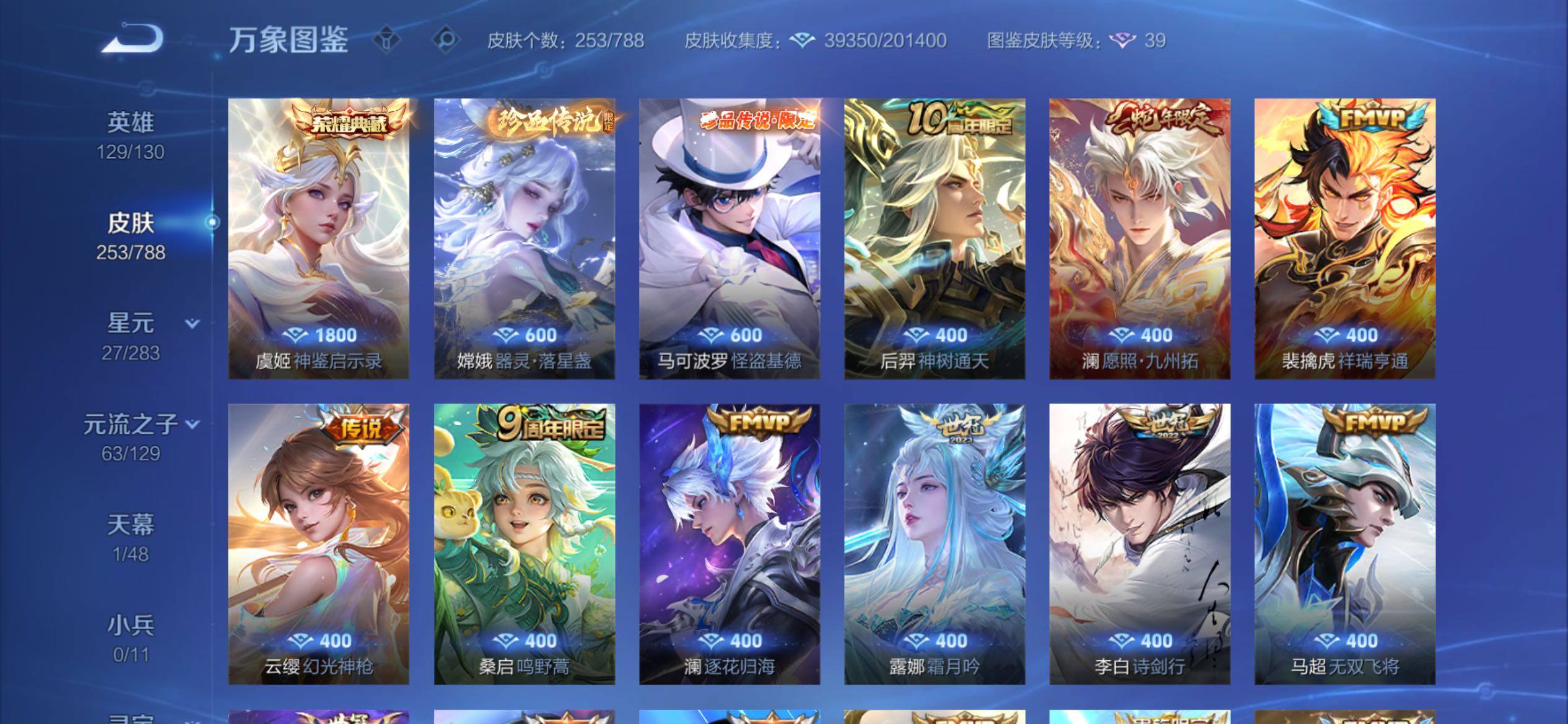可换绑【高质量精品号·虞姬典藏·2珍品怪盗基德·澜蛇限·孙行者·神威·蓝屏警告·大圣娶亲·至尊宝·冰锋战神】3225星币 13按键,1星传说,1天幕,6王者印记,五级铭文200,无二次,苹果Q-V8-253皮肤-1典藏皮肤-2珍品传说-25传说-61史诗【英雄全皮】:孙权全皮,敖隐全皮【荣耀典藏】:虞姬神鉴启示录【珍品传说】:嫦娥器灵落星盏,马可波罗怪盗基德【星元皮肤】:貂蝉金色仲夏夜【天幕】:财神纳福天幕【传说皮肤】:后羿神树通天,澜愿照九州拓,云缨幻光神枪,裴擒虎祥瑞亨通,桑启鸣野蒿,澜逐花