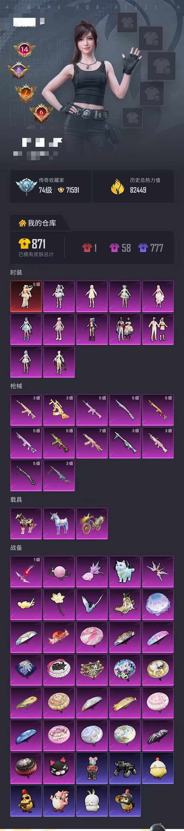 132-【无敌战神5级露米娜1红装11粉装12特效枪3载具】 苹果V区-82449热力值-历史最高段位:无敌战神-161套装-213枪皮 【1红装】 精灵之光-露米娜(5级)【3载具】 星梦玉骢 辉羽雀灵自行车 黑曜夜骑【2稀有】 派对舞王 派对舞王(金靴子)【11粉装】 第五大道 霁蓝缠春 虹云熊熊 白勺歌姬 角色-绝对恒星 星穹咏叹调 角色-狂魅哈莉 角色-鸢尾晶梦 角色-绝色倾城 角色-奇迹舞步 美琪 角色-羊梦糖心【12特效枪】 MG3-洛神天依(3级) Mk14-福马献瑞(5级) AK
