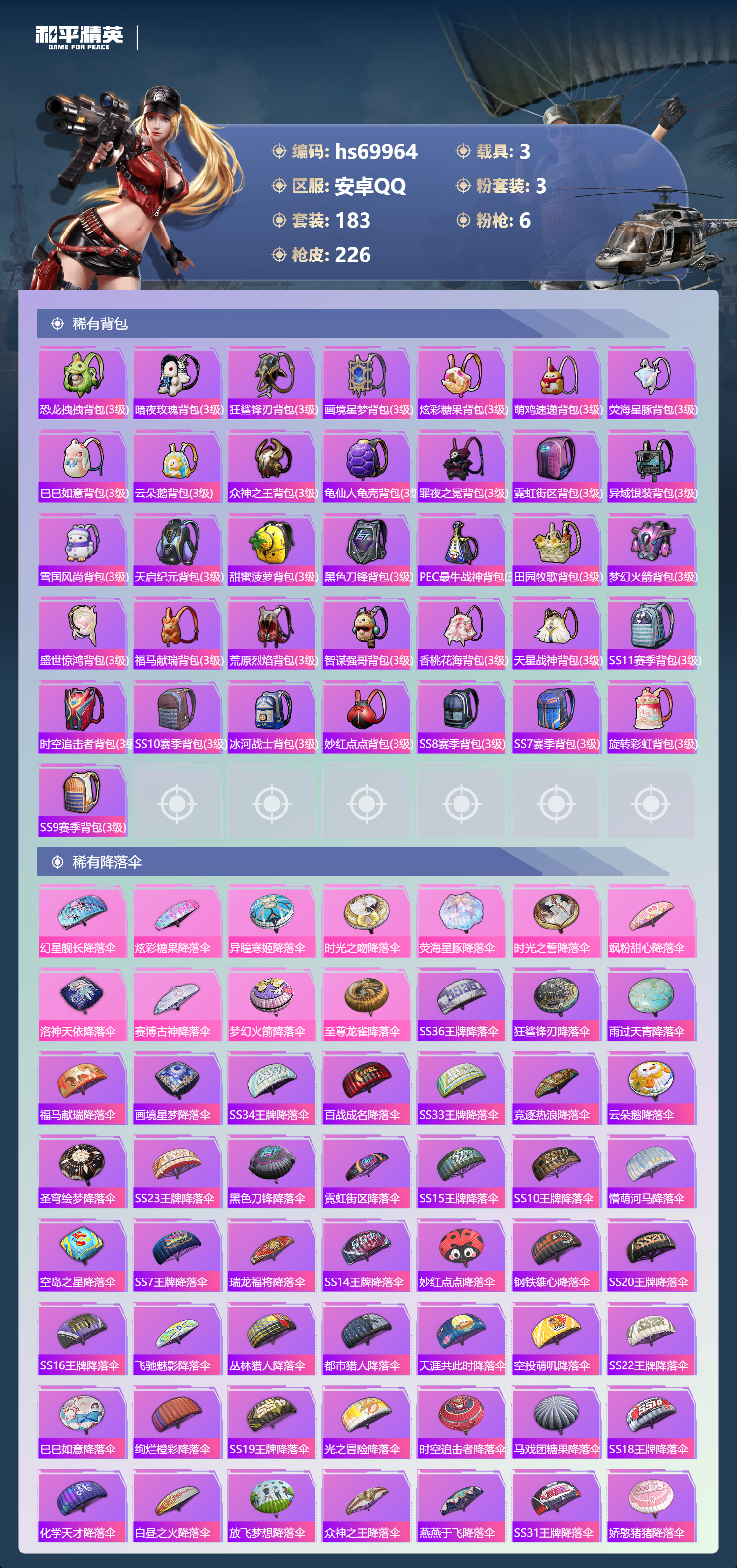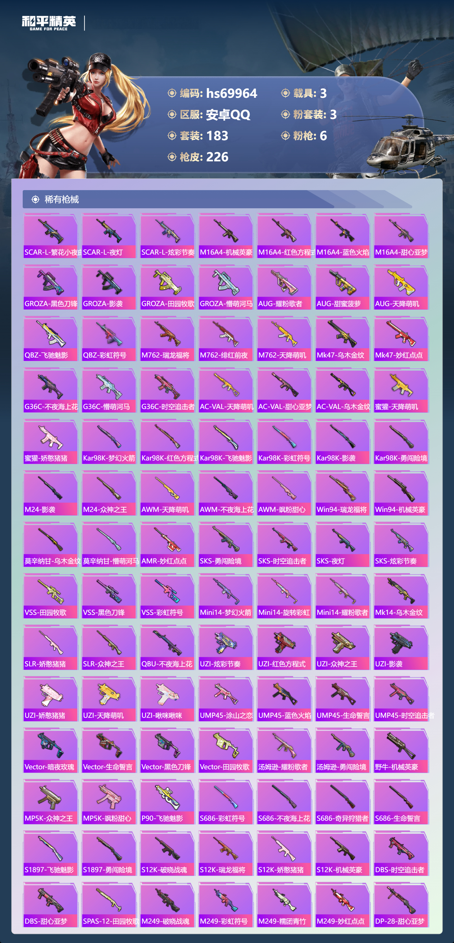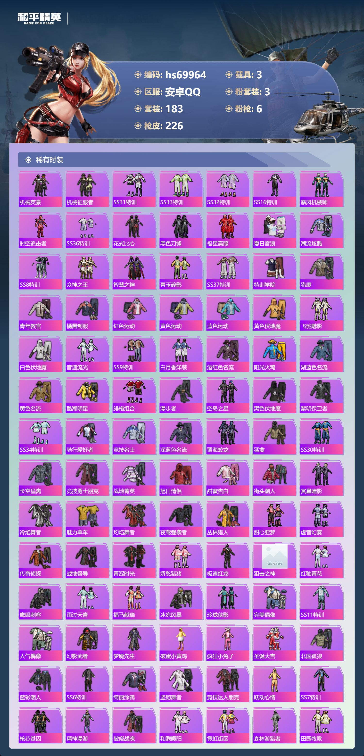 hs69964 安卓手Q-27王牌印记-有战神框-3粉装-6特效枪-3载具-74236热力值-183套装-226枪皮-4卓越印记