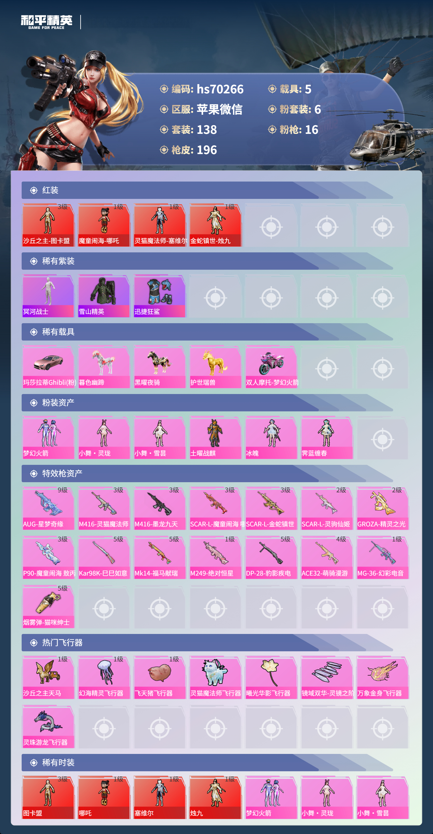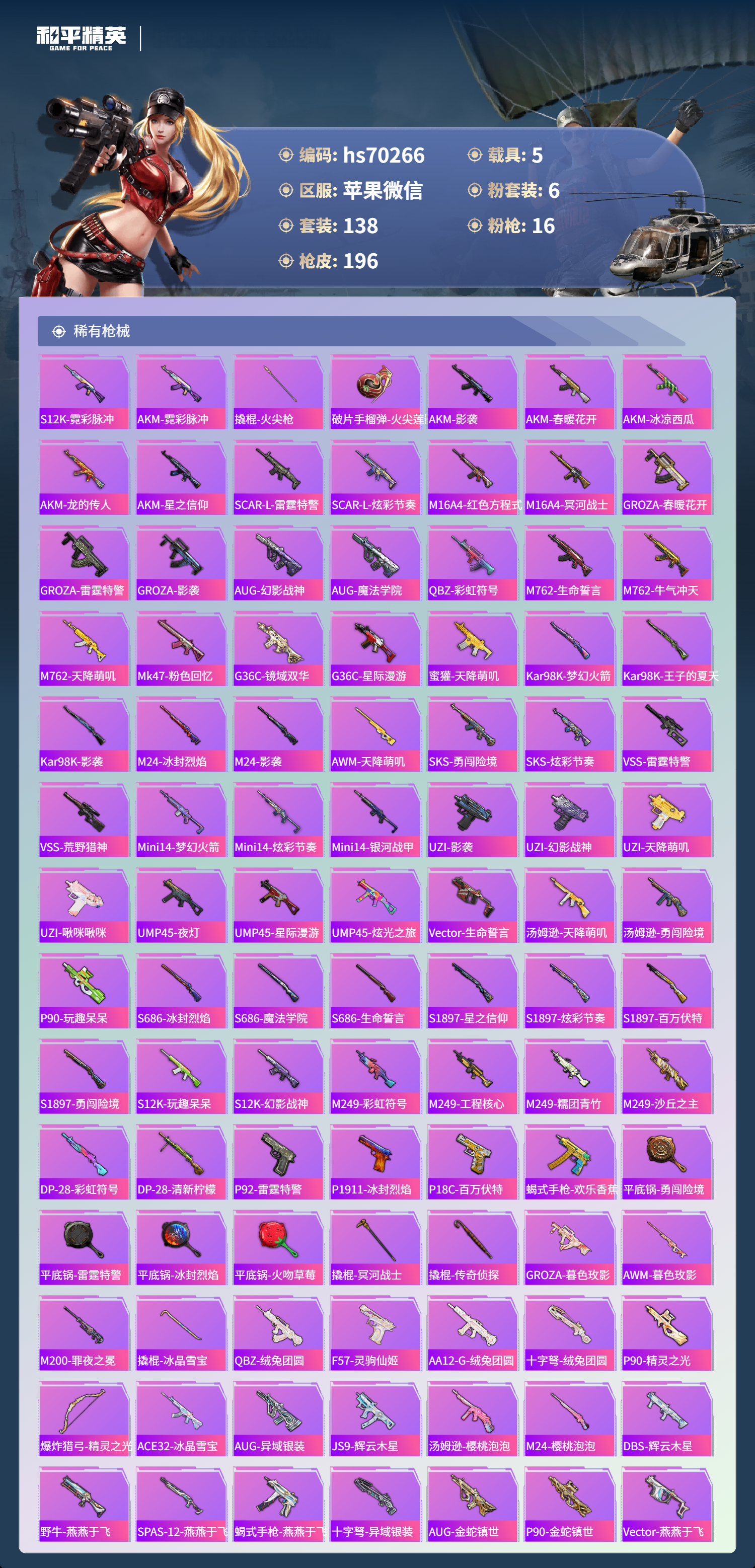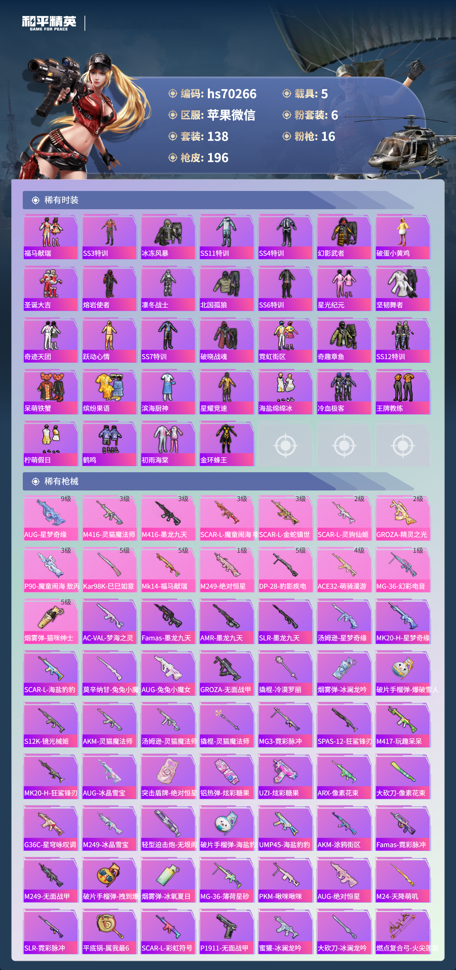 hs70266 苹果微信-10王牌印记-有战神框-4红装-6粉装-16特效枪-5载具-76509热力值-138套装-196枪皮-7卓越印记-7传奇印记