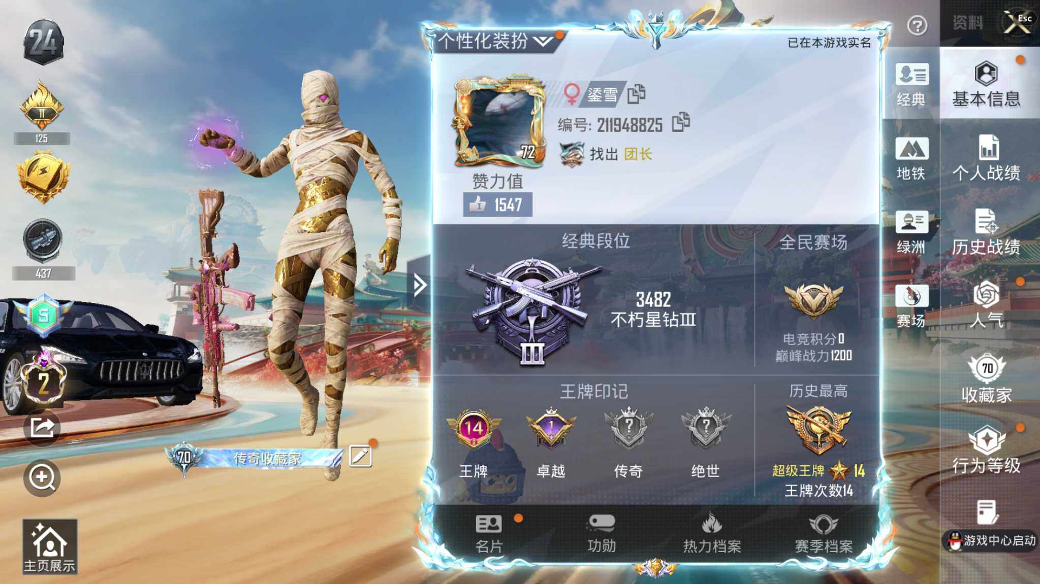 【A10080】苹果【神装号/14王牌印记/沙丘之主-图卡盟(二级)/赤蝎幽灵/小丑鱼/暗影哥特/1神装-4粉装-9特效枪-2载具-3粉色飞行器】 手Q--76406热力值-14王牌印记-160套装-218枪皮