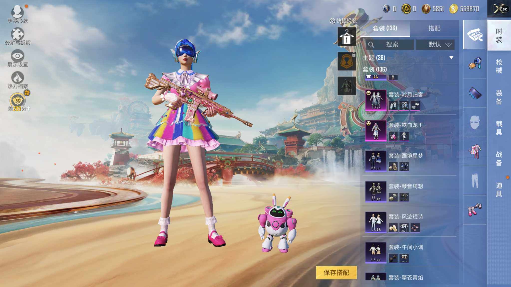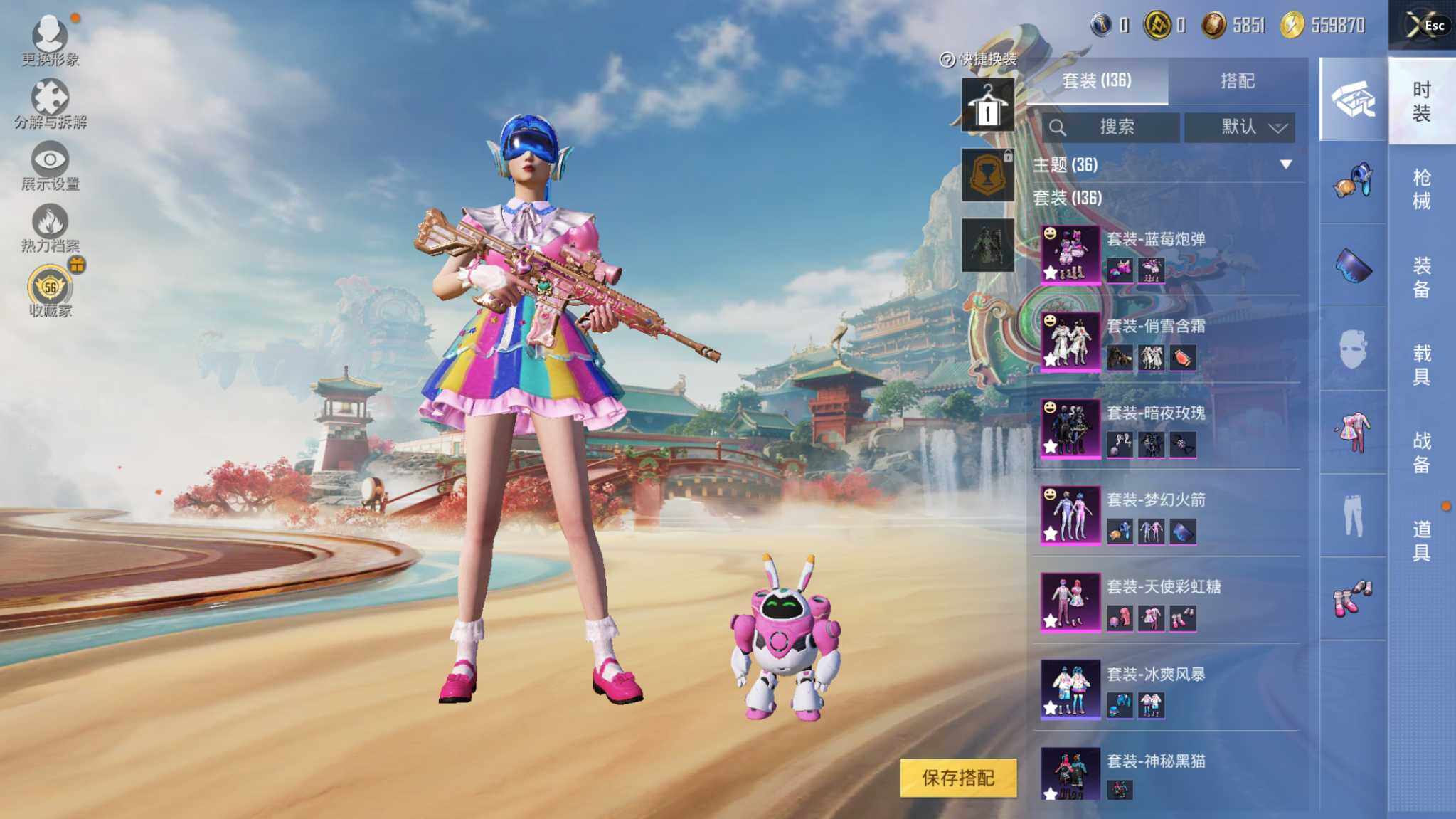 【A9702】安卓【公主号 粉装-梦幻火箭,套装-粉红小猪,粉装-天使彩虹糖,M416-心之恋语(七级),SLR-暗夜玫瑰(六级),M417-第五大道(七级),百万伏特背包(3级)】 手Q-7粉装-4特效枪-0载具-1粉色飞行器-55496热力值-8王牌印记-136套装-167枪皮