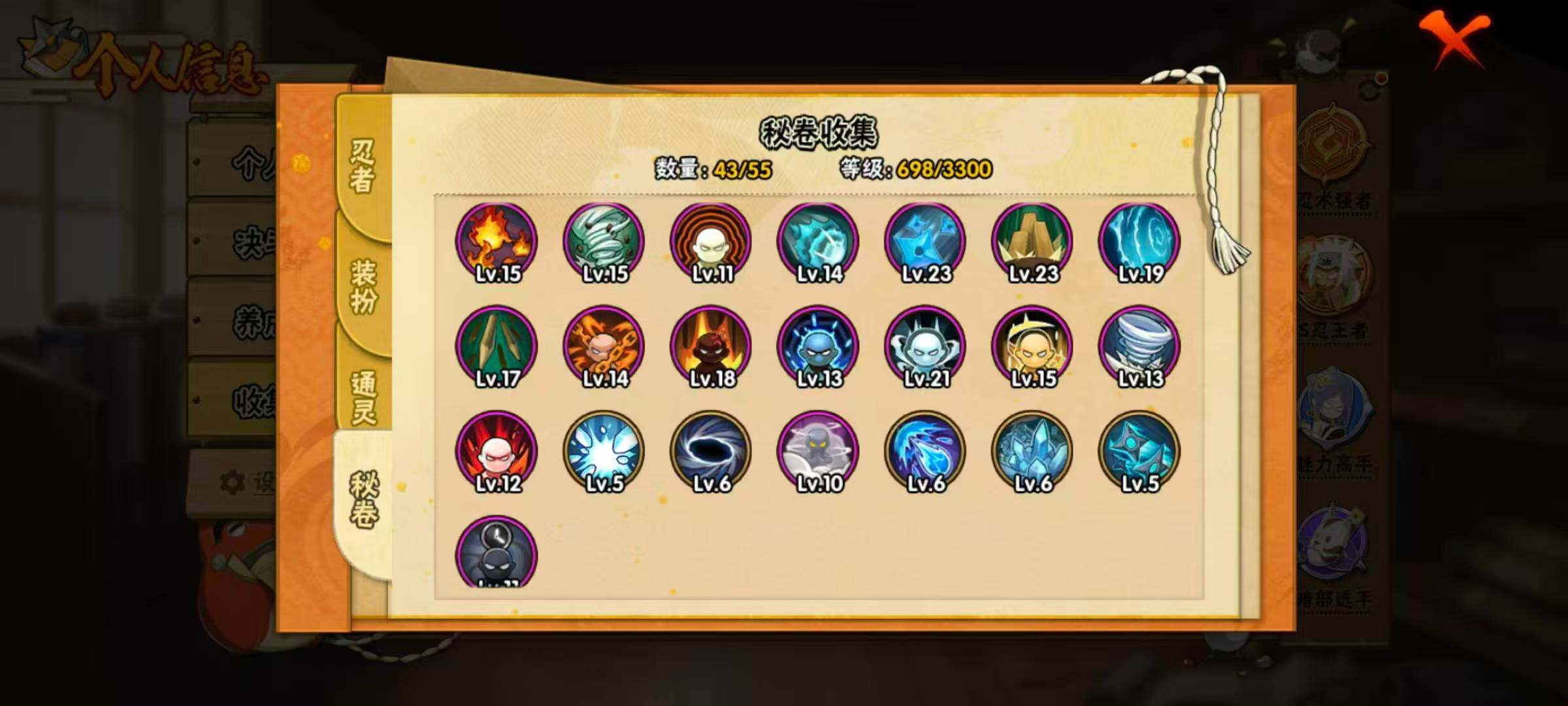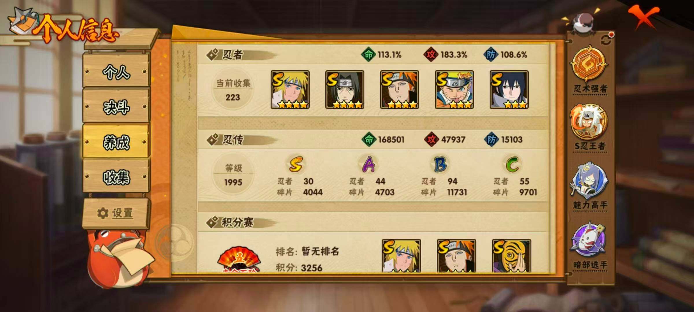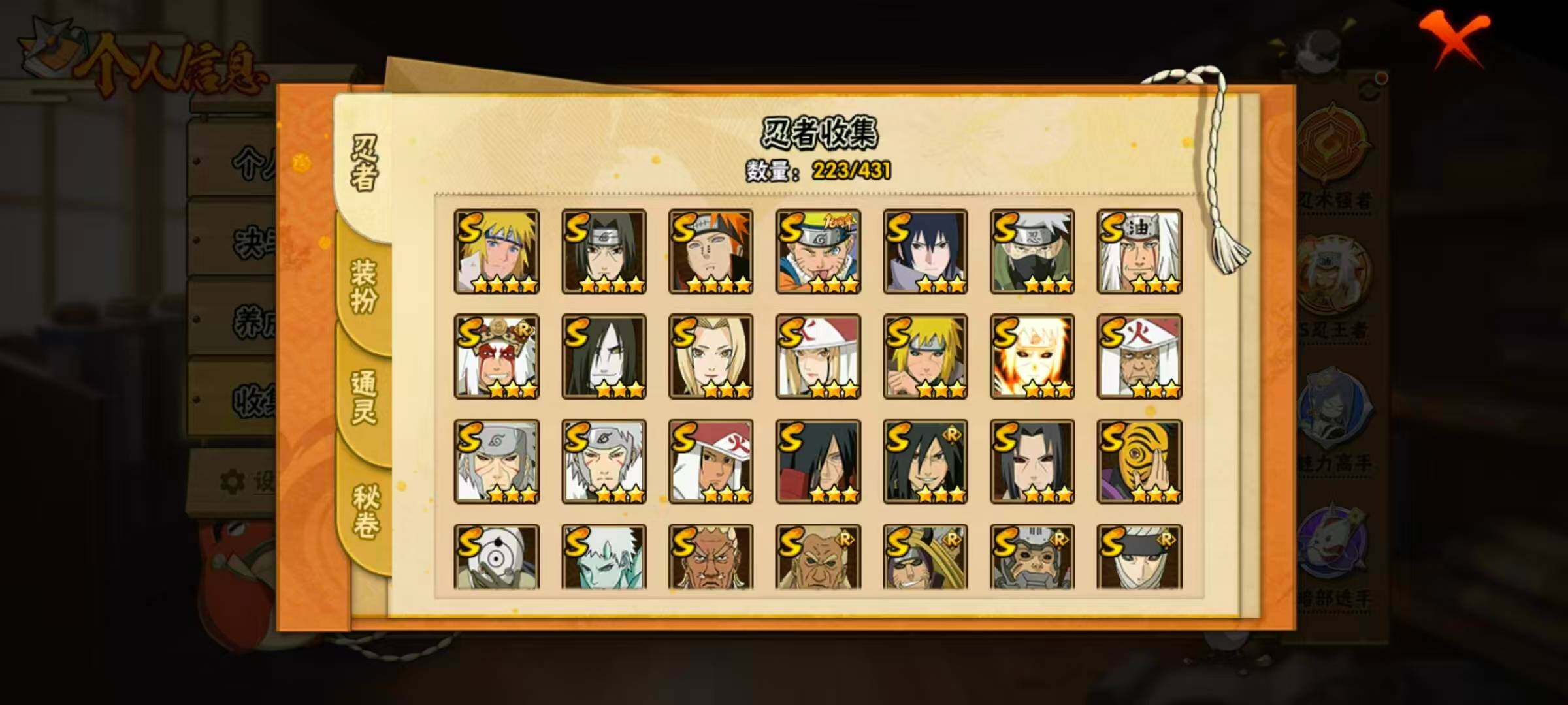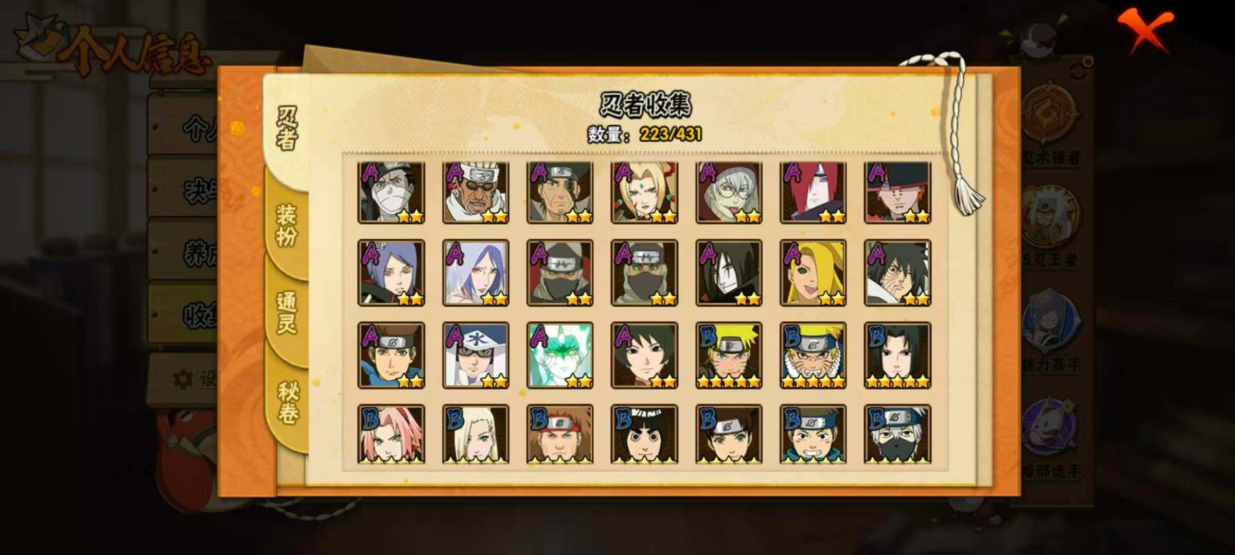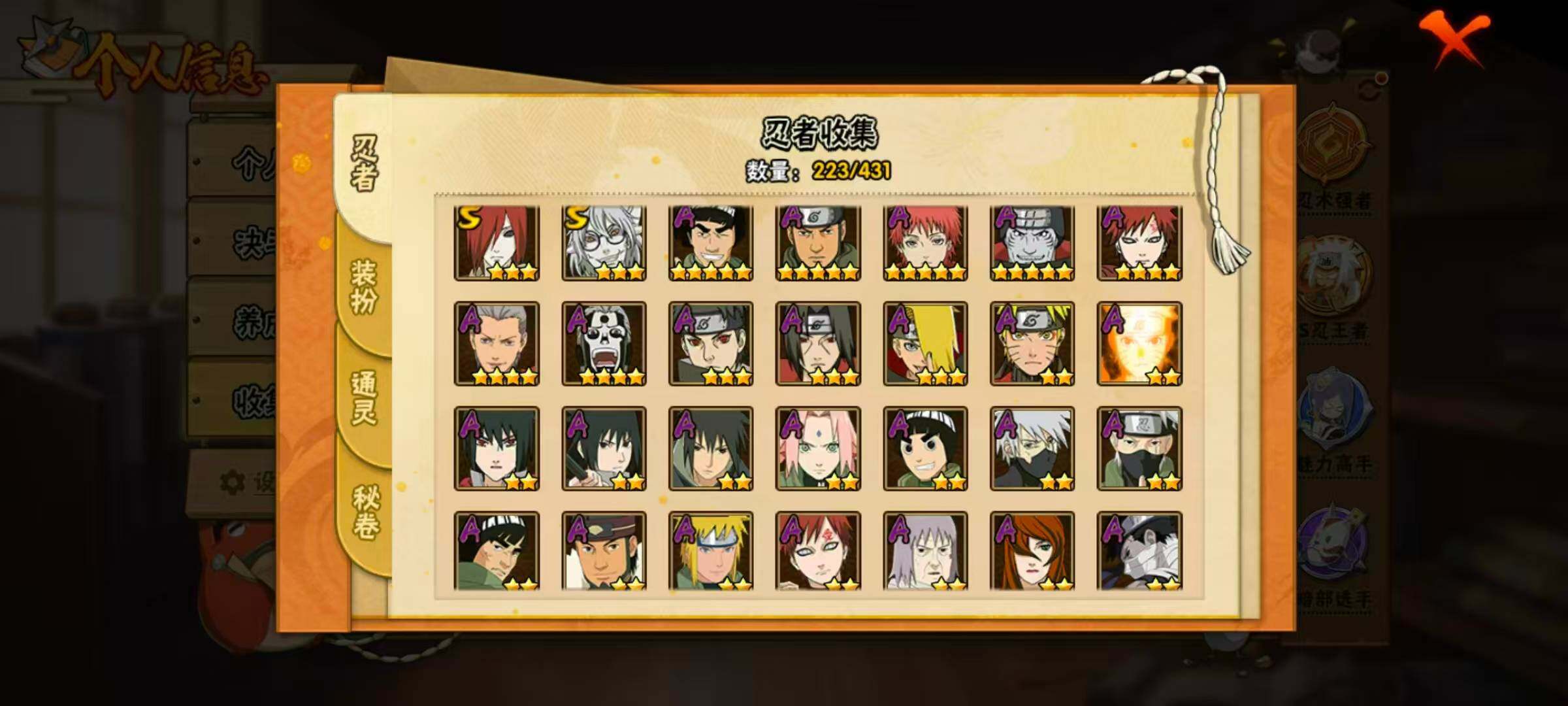 30S级忍者数-44A级忍者数【S级忍者】:长门「秽土转生」(3星),半藏「秽土转生」(3星),金角·银角「秽土转生」(3星),波风水门「秽土转生」(3星),千手扉间「秽土转生」(3星),宇智波鼬「秽土转生」(3星),宇智波斑「秽土转生」(3星),宇智波鼬「须佐能乎」(4星),旗木卡卡西「须佐能乎」(3星),无「二代目土影」(3星),艾「四代目雷影」(3星),艾「三代目雷影」(3星),自来也(3星),自来也「舞之豪杰」(3星),大蛇丸(3星),纲手(3星),纲手「百豪」(3星),千手柱间(3星)