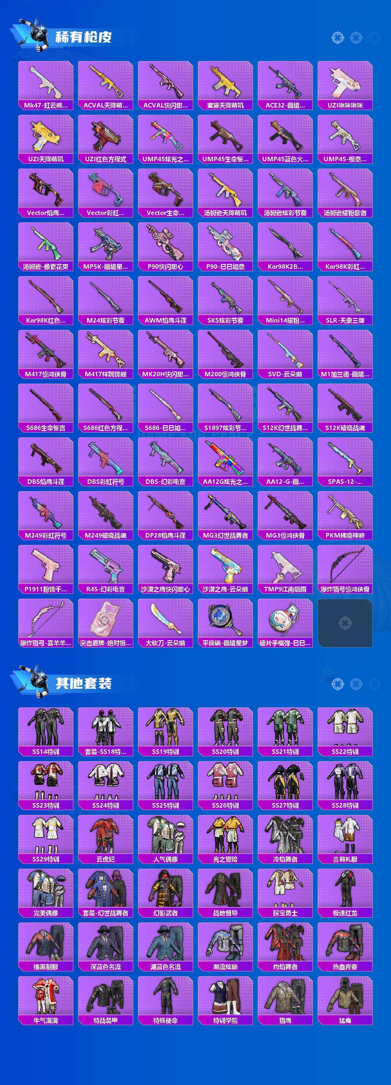 【粉色枪皮等级】:M416-电玩时刻(五级),ACE32-萌骑漫游(四级),AKS-74U-森灵之息(五级),Kar98K-巳巳如意(五级),Mk14-福马献瑞(五级),DP-28-豹影疾电(五级)