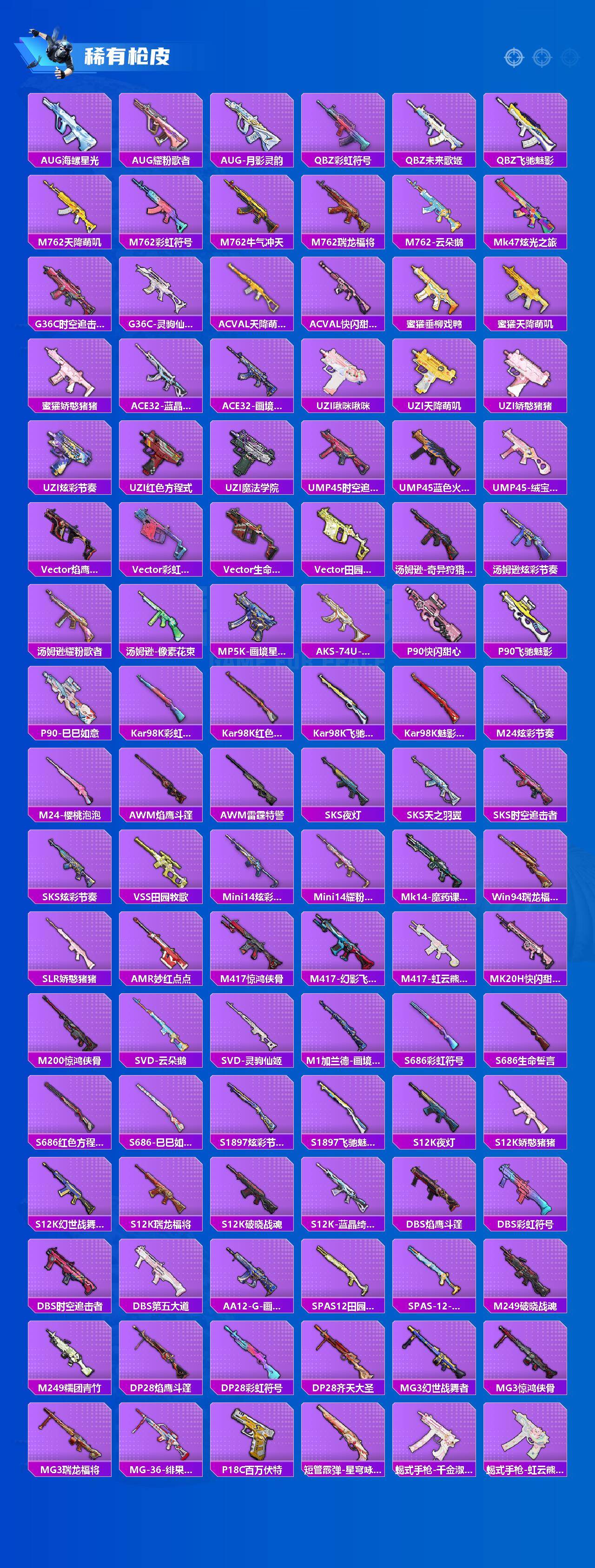 【粉色枪皮等级】:SCAR-L-锦绣绵绵(五级),M416-电玩时刻(五级),GROZA-镜光银凌(五级),AKS-74U-森灵之息(五级),Kar98K-巳巳如意(五级),Mk14-甜梦熊击(五级),Mk14-福马