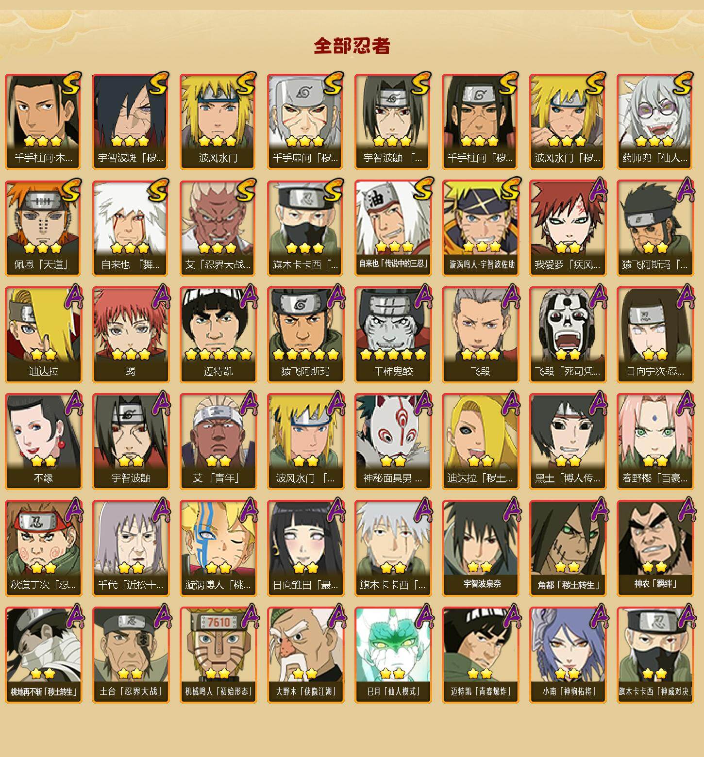 【S级忍者】:波风水门「秽土转生」(3星),千手扉间「秽土转生」(3星),千手柱间「秽土转生」(3星),宇智波斑「秽土转生·解」(3星),艾「忍界大战」(3星),宇智波鼬「须佐能乎」(3星),旗木卡卡西「须佐能乎」(3星),千手柱间「木叶创立」(3星),自来也「舞之豪杰」(3星),自来也「传说中的三忍」(3星),波风水门(3星),药师兜「仙人模式」(3星),佩恩「天道」(3星),漩涡鸣人·宇智波佐助(3星)
