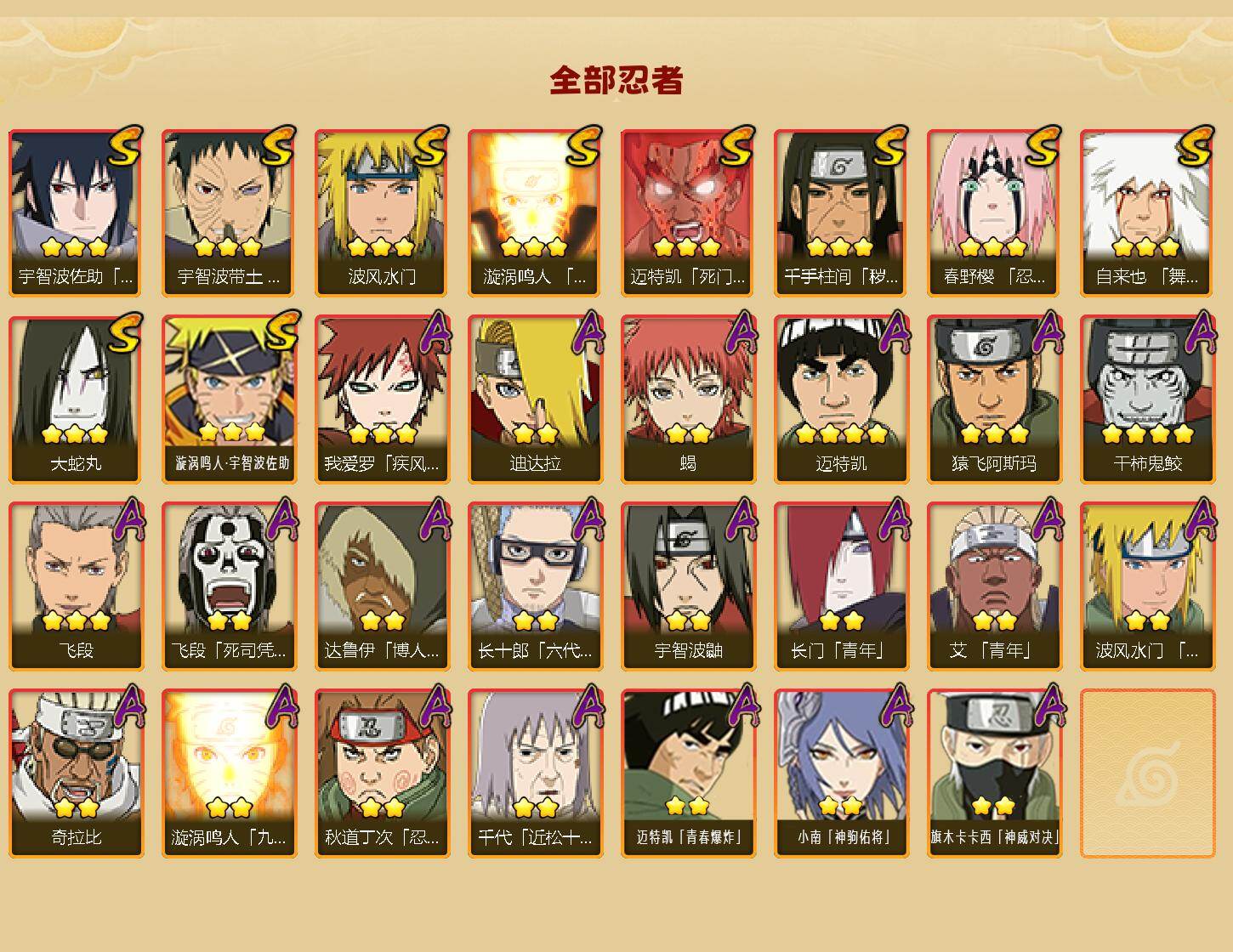 【S级忍者】:千手柱间「秽土转生」(3星),春野樱「忍界大战」(3星),宇智波带土「忍界大战」(3星),自来也「舞之豪杰」(3星),大蛇丸(3星),波风水门(3星),漩涡鸣人「九喇嘛连结」(3星),迈特凯「死门」(3星),宇智波佐助「永恒万花筒」(3星),漩涡鸣人·宇智波佐助(3星)