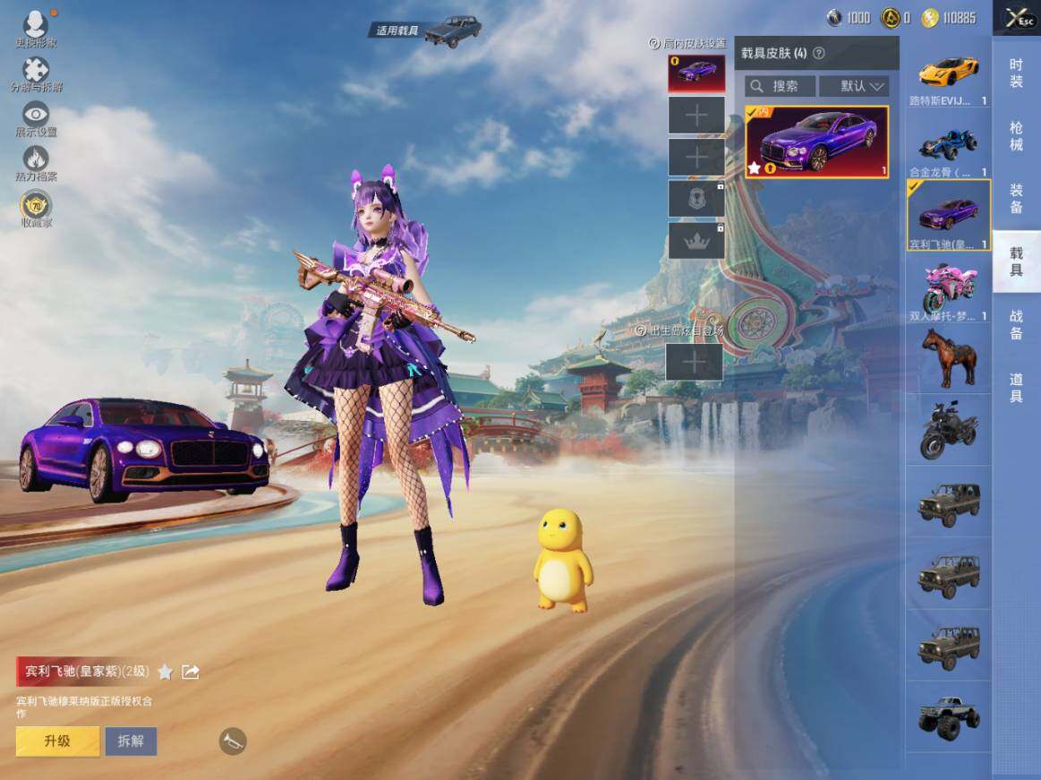 【A8765】安卓【极品车载号/宾利飞驰(皇家紫)(二级)/梦幻火箭/洛天依/小叽联名款/小丑鱼/15粉装-12特效枪-4载具-2粉色飞行器】 手Q--71989热力值-6王牌印记-126套装-195枪皮