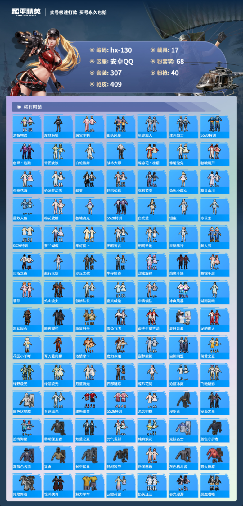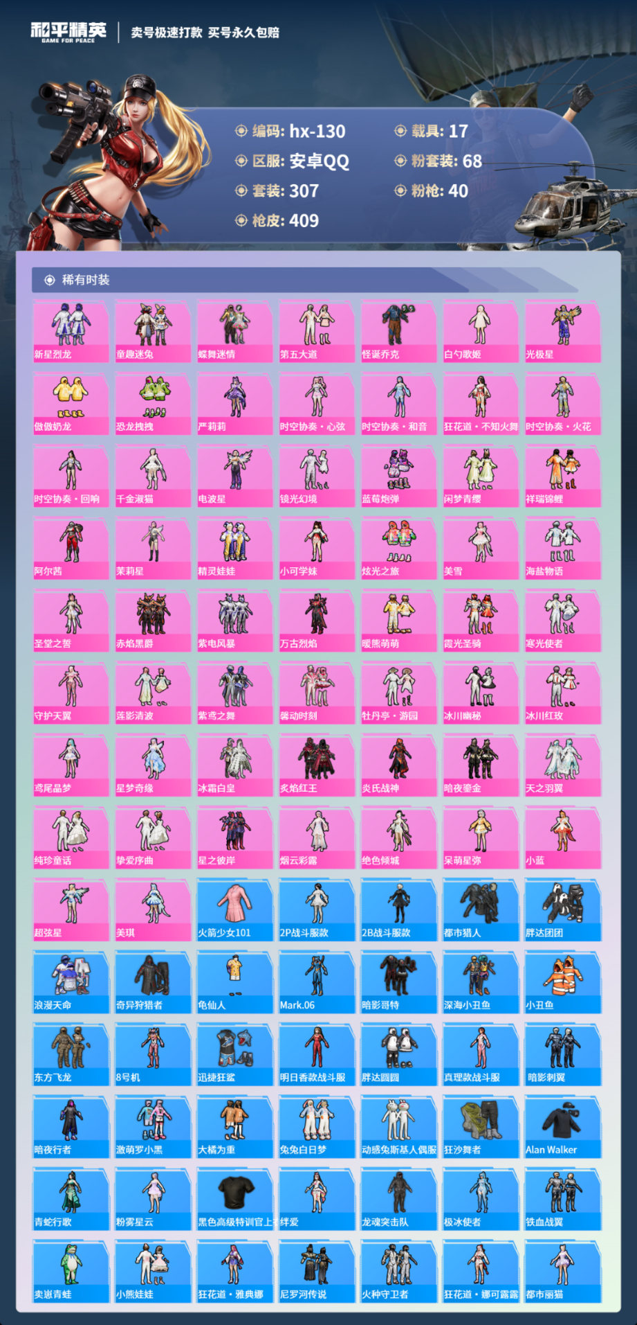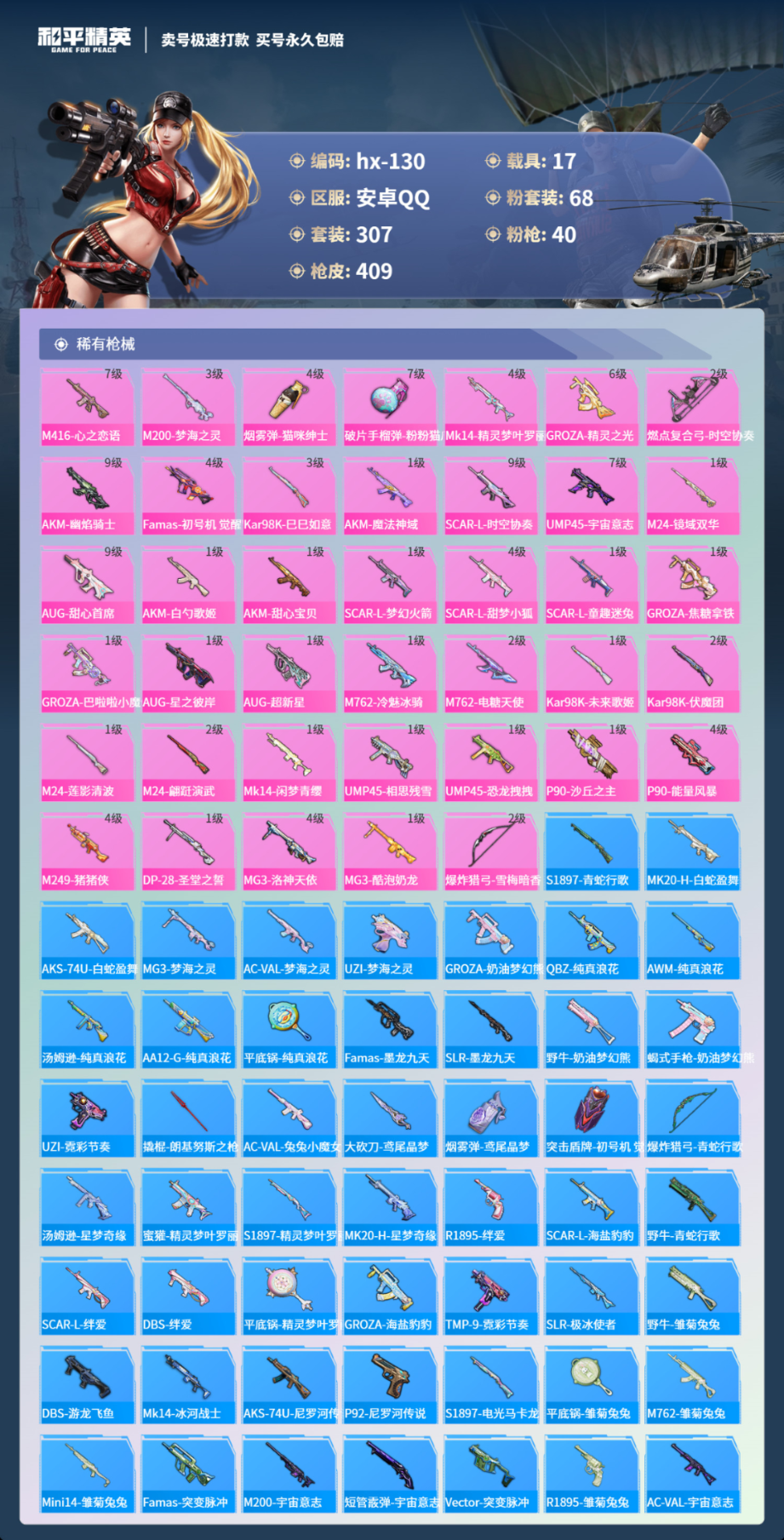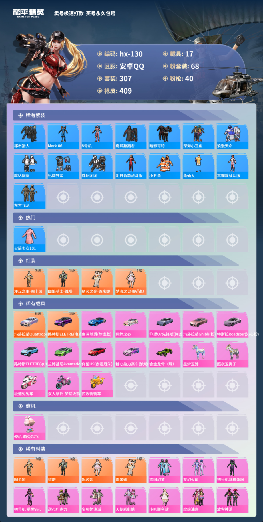 17载具307套装-409枪皮-安卓手Q-15王牌印记-有战神框-68粉装-40特效枪-17载具-热力值-307套装-409枪皮-3卓越印记-1传奇印记