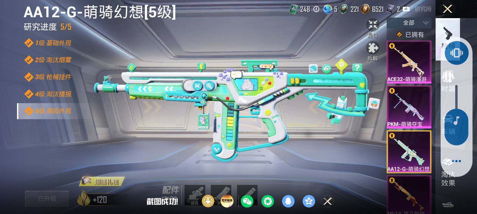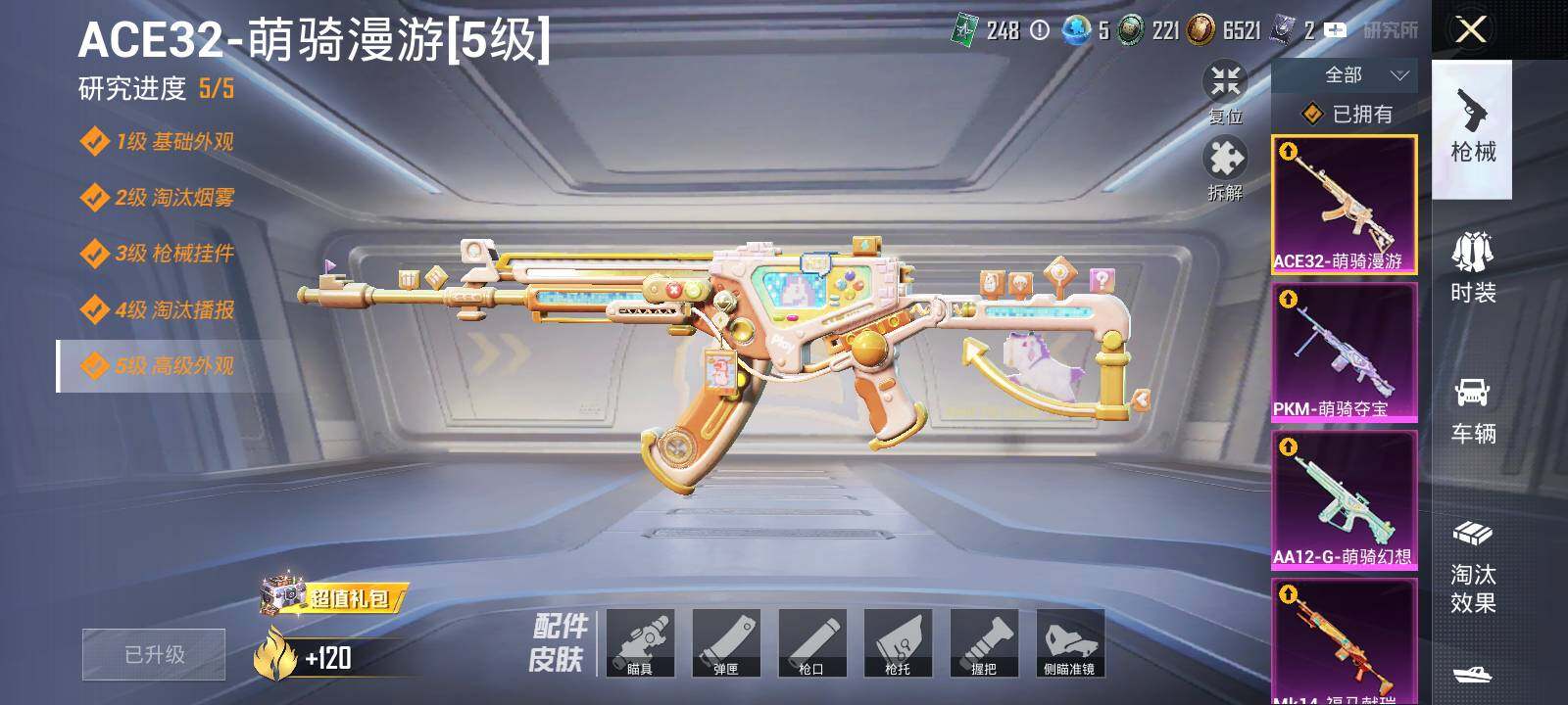 【粉色枪皮等级】:M416-风花雪月(七级),GROZA-香水柠檬(四级),AUG-暖羊咩咩(五级),ACE32-萌骑漫游(五级),AKS-74U-星穹咏叹调(七