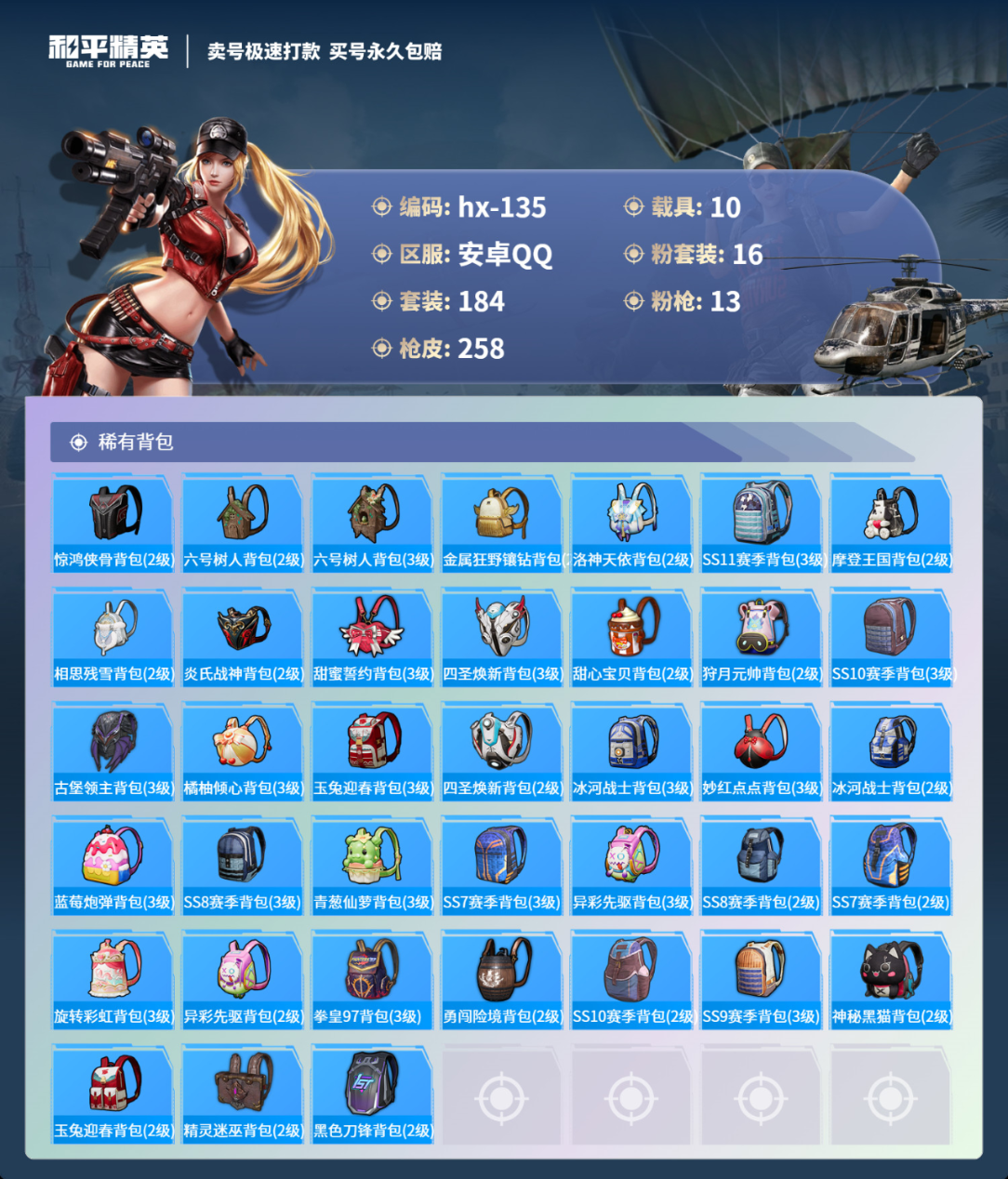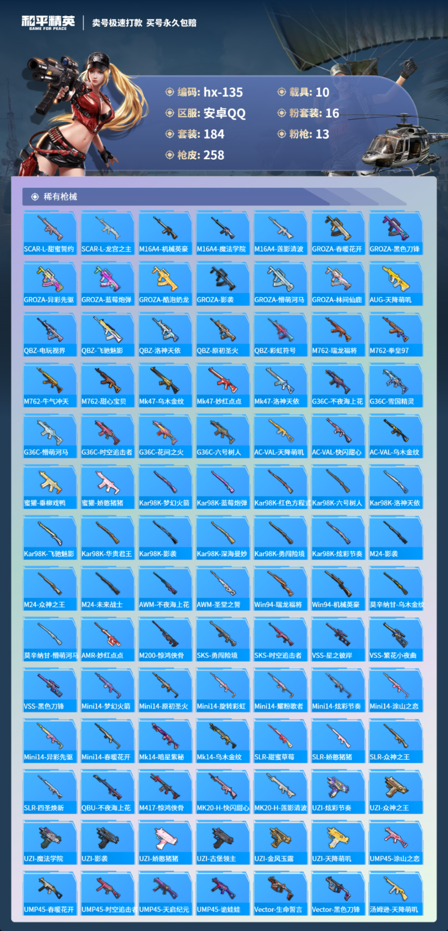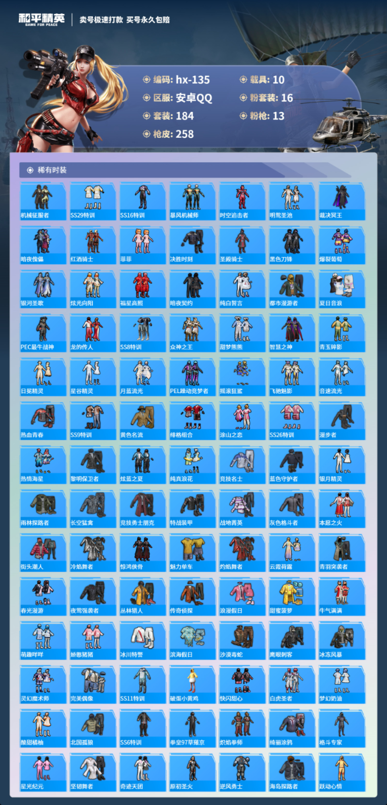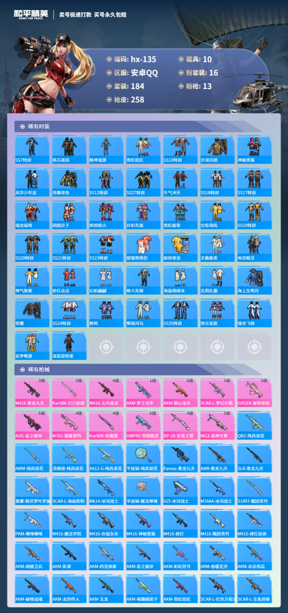 10载具184套装-258枪皮-安卓手Q-10王牌印记-16粉装-13特效枪-10载具-热力值-184套装-258枪皮-3卓越印记-1传奇印记