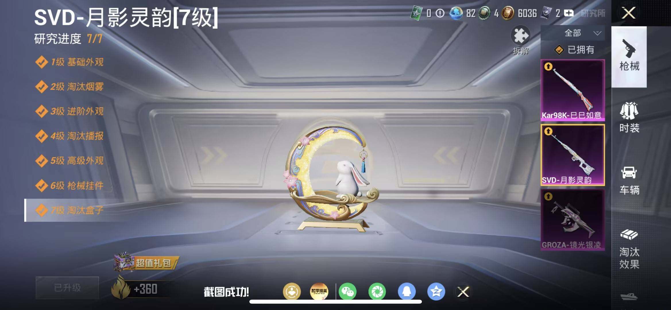 【粉色枪皮等级】:GROZA-镜光银凌(五级),Kar98K-巳巳如意(五级),SVD-月影灵韵(七级)