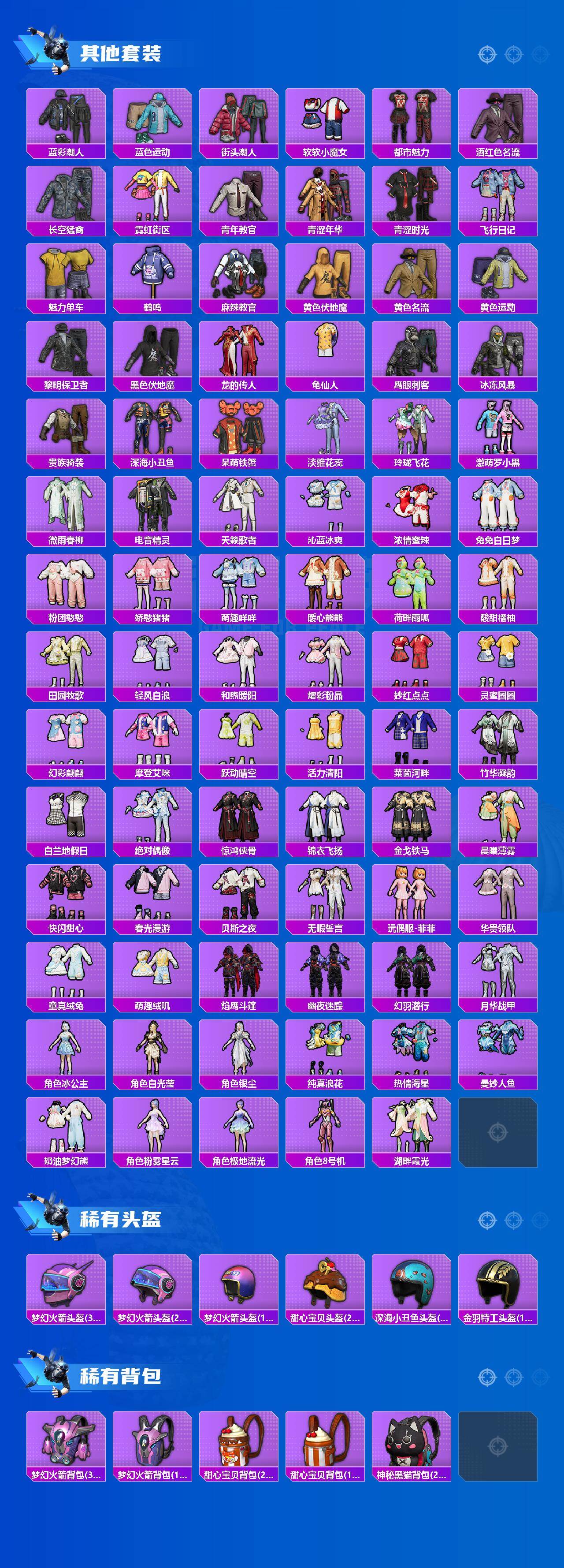 【热门品类】:粉装-梦幻火箭,粉装-缤纷油彩,套装-浪漫天命,套装-深海小丑鱼,套装-小丑鱼,套装-胖达团团,套装-胖达圆圆,套装-龟仙人,套装-暗影哥特,角色-8号机