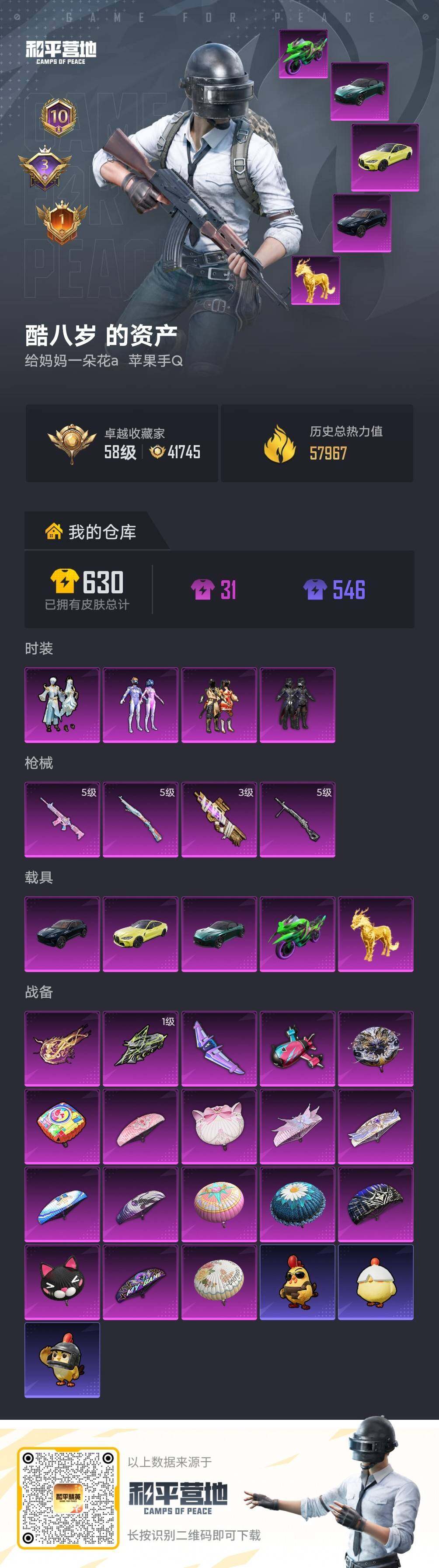 【特价出售/店主推荐】/绝世印记1安卓 手Q-3粉装-4特效枪-2载具-1粉色飞行器-5w热力值-11王牌印记-150套装-176枪皮【热门品类】:套装-粉红小猪【粉色套装】:角色-狂花道·不知火舞,角色-月影灵韵,角色-异瞳寒姬【粉色枪皮等级】:UMP45-萌骑冒险(五级),Kar98K-巳巳如意(五级),Mk14-福马献瑞(五级),DP-28-豹影疾电(五级)【粉色载具】:保时捷Paname