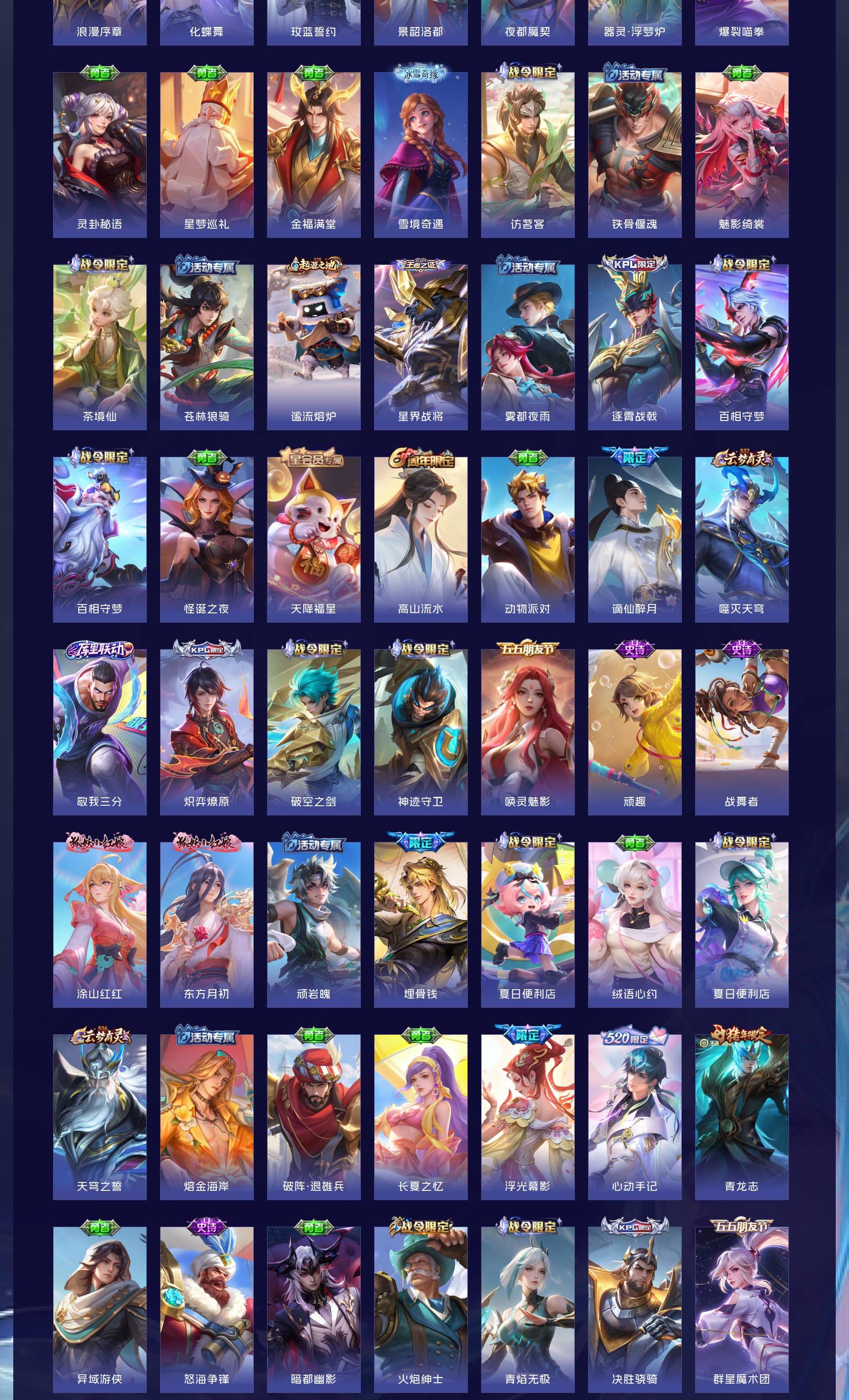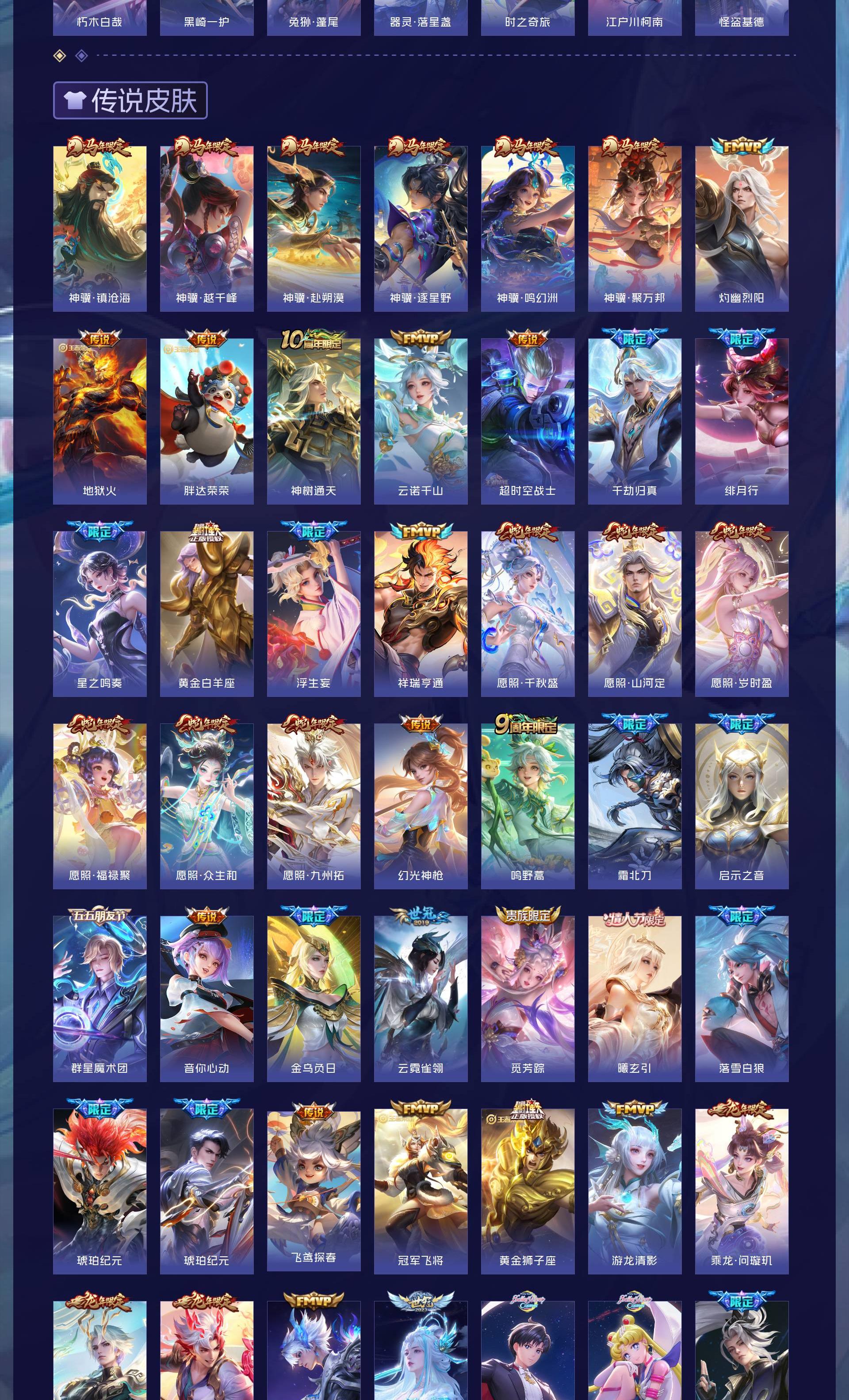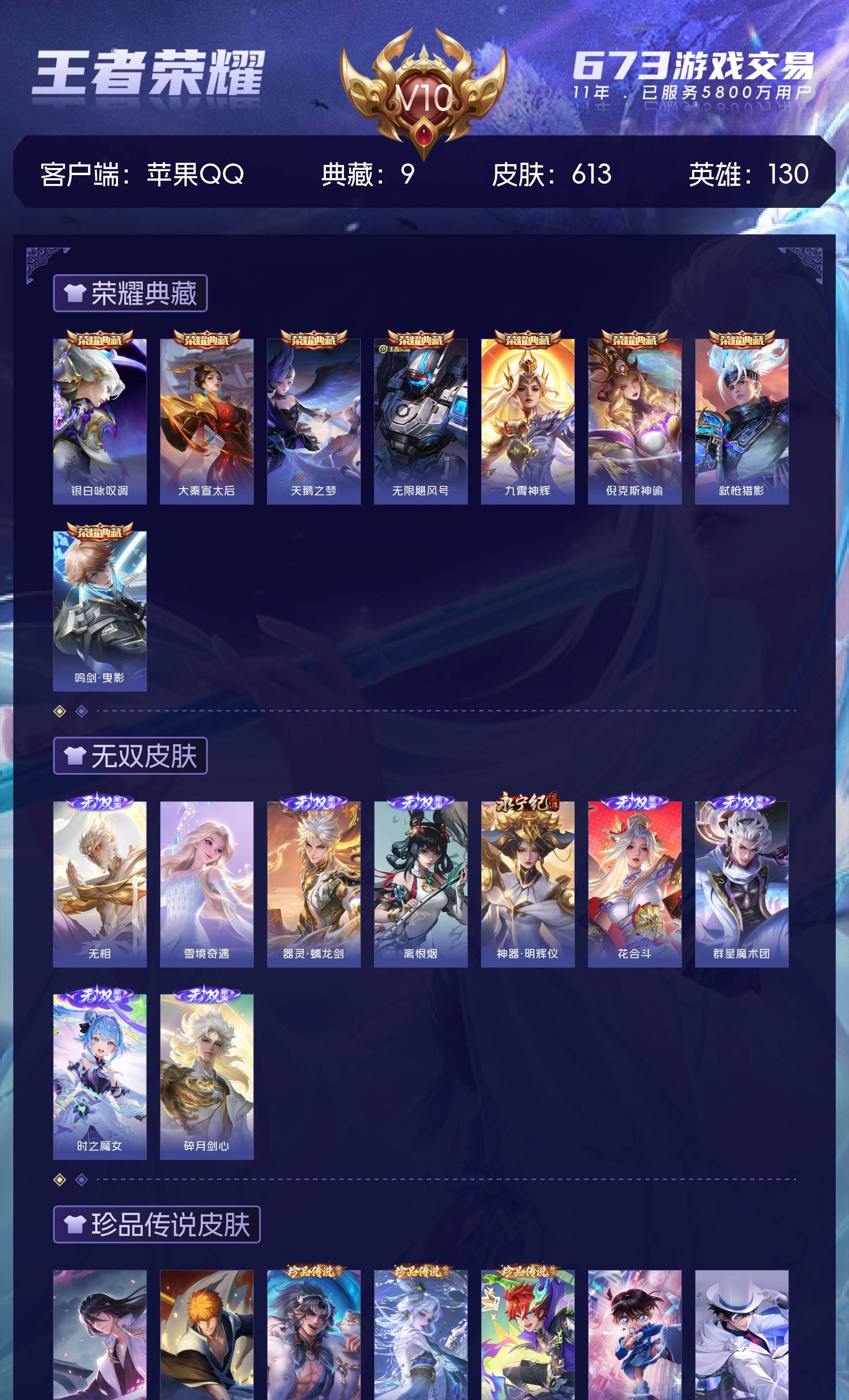 V10 皮肤613 英雄130 最强王者 荣耀典藏9 无双皮肤9 珍品传说7 星传说7 传说82