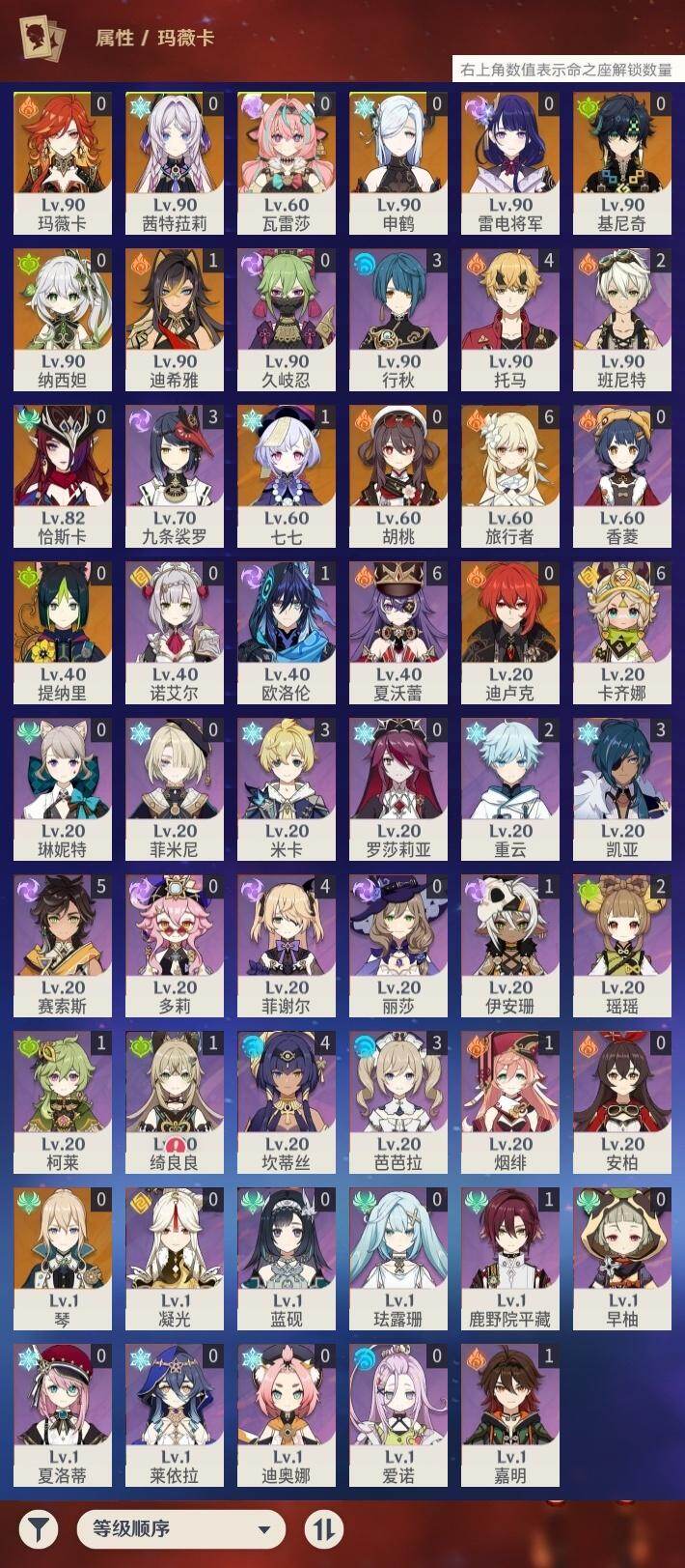 1命迪希雅,0命纳西妲,0命提纳里,0命申鹤,0命雷电将军,0命胡桃,1命七七,0命琴,0命迪卢克,0命基尼奇,0命恰斯卡,0命玛薇卡,0命茜特菈莉,0命瓦雷莎,精1最初的大魔术,精1千夜浮梦,精1四风原典,精1天空之翼,精1阿莫斯之弓,精1山王长牙,精1焚曜千阳,精1支离轮光