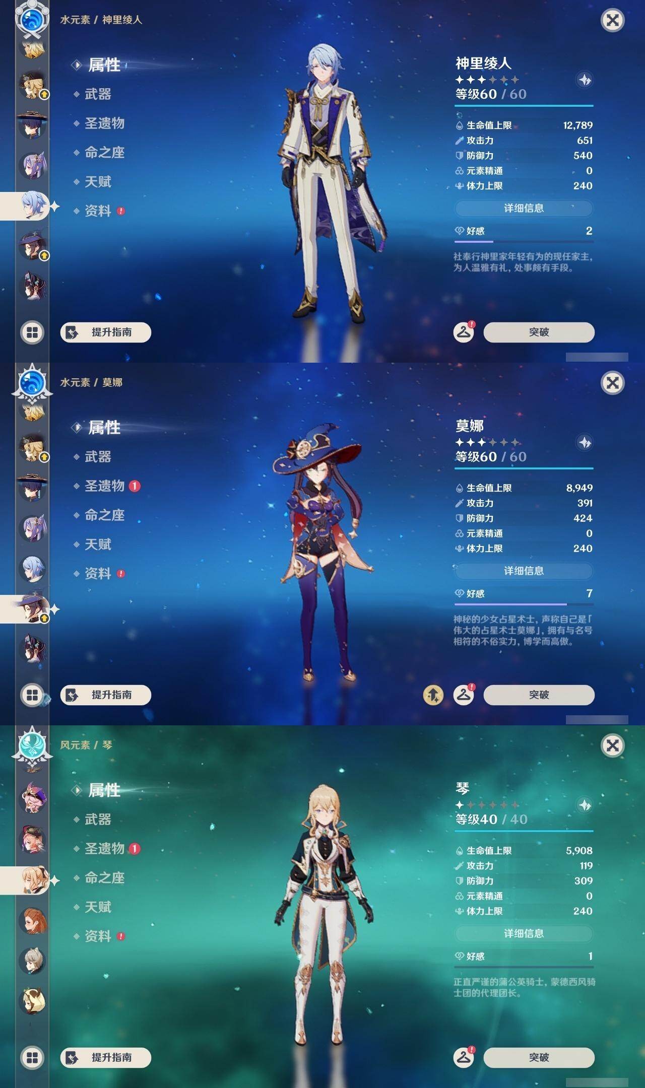 0命阿蕾奇诺,0命娜维娅,0命那维莱特,0命流浪者,0命提纳里,0命神里绫人,0命八重神子,0命荒泷一斗,0命枫原万叶,0命神里绫华,0命钟离,0命胡桃,0命达达利亚,1命刻晴,2命七七,0命琴,1命莫娜,0命希诺宁,精1万世流涌大典,精1天空之脊,精1尘世之锁,精1狼的末路