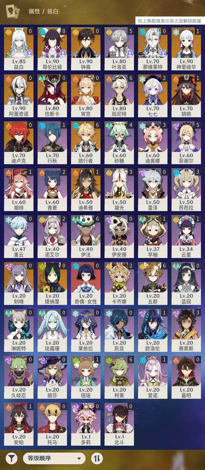 0命阿蕾奇诺,0命那维莱特,1命迪希雅,0命提纳里,1命神里绫华,0命钟离,1命胡桃,0命宵宫,0命刻晴,2命七七,0命迪卢克,0命恰斯卡,0命哥伦比娅,0命兹白,精1飞雷之弦振,精1磐岩结绿,精1天空之卷,精1狼的末路,精1帷间夜曲