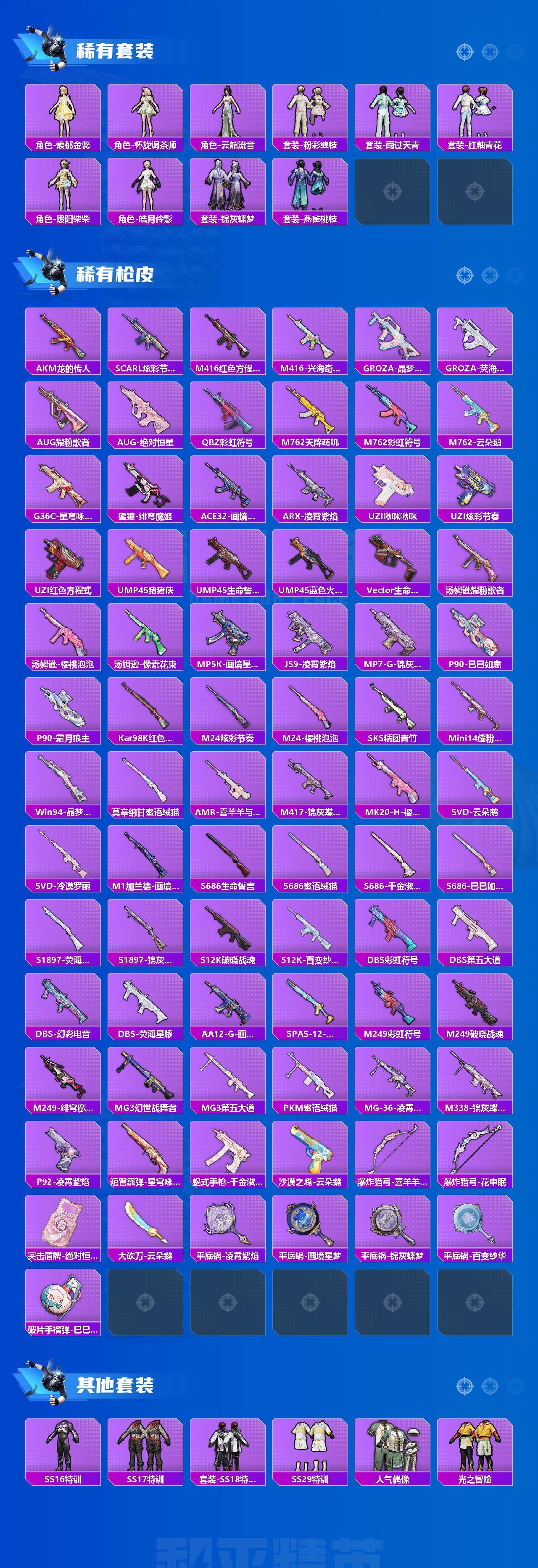 【粉色枪皮等级】:Kar98K-巳巳如意(五级),Mk14-樱桃泡泡(七级),Mk14-福马献瑞(五级),AMR-智耀战神(七级),SPAS-12-蜜语绒猫(四级)