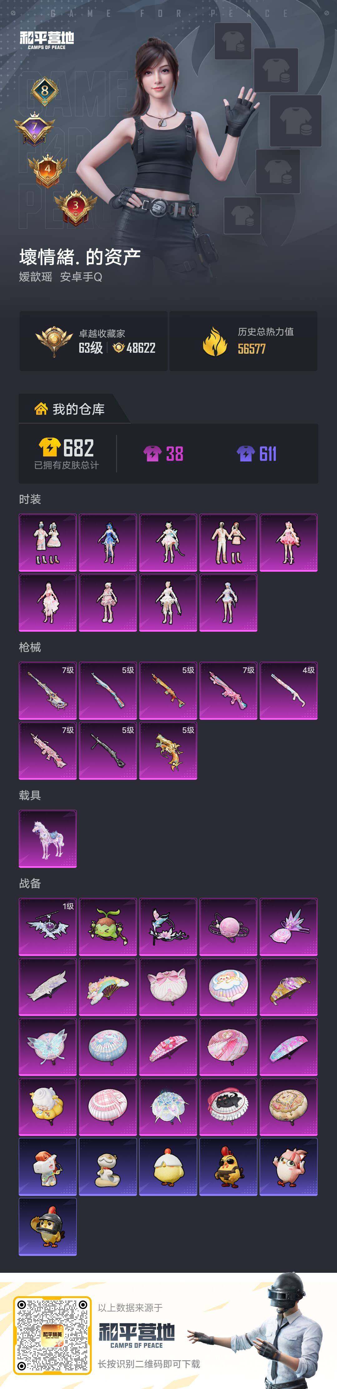 9粉装-8特效枪-1载具-5粉色飞行器-56577热力值-8王牌印记-145套装-167枪皮