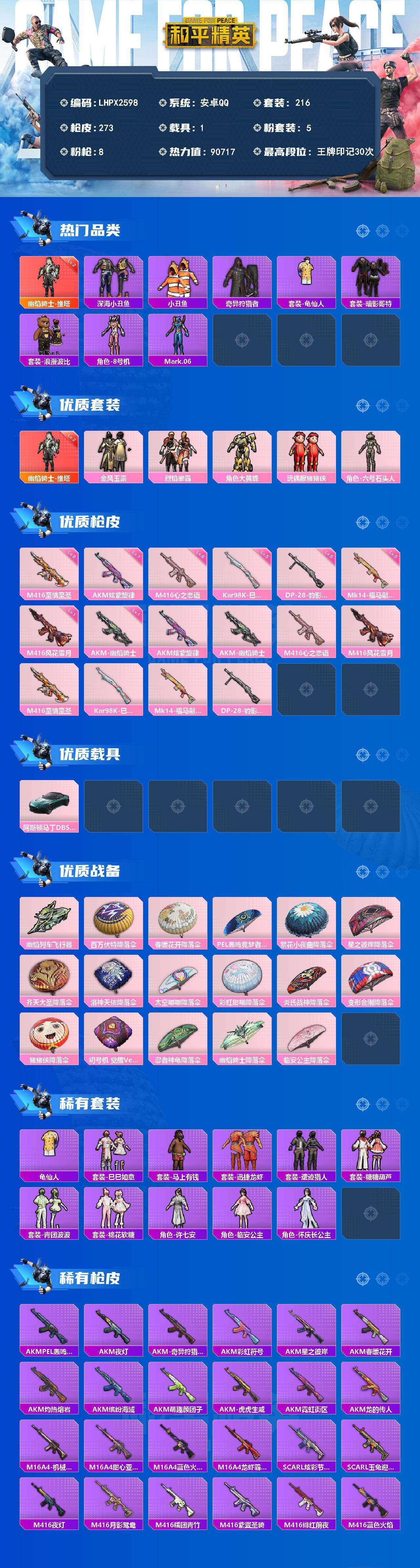 M416-至情至圣(九级)【特价出售/店主推荐--热门套装小丑鱼哥特小螳螂】安卓 手Q-1神装-5粉装-8特效枪-1载具-1粉色飞行器-90717热力值-30王牌印记-216套装-273枪皮【红色神装等级】:幽焰骑士-维塔(二级)【热门品类】:套装-深海小丑鱼,套装-小丑鱼,套装-奇异狩猎者,套装-龟仙人,套装-暗影哥特,套装-浪漫波比,角色-8号机,角色-Mark.06【粉色套装】:粉装-金风