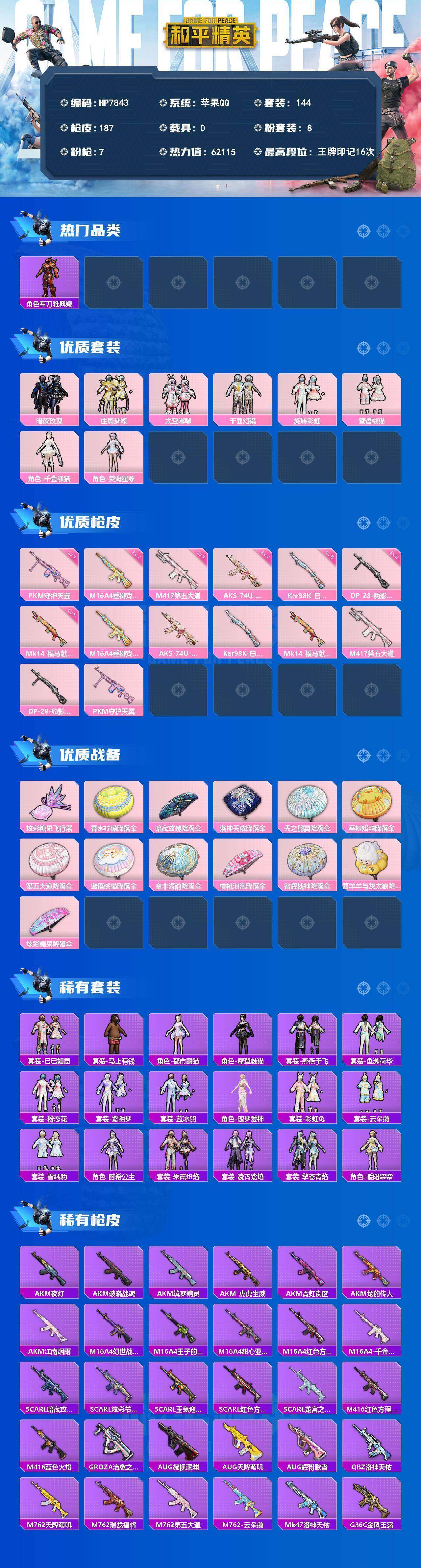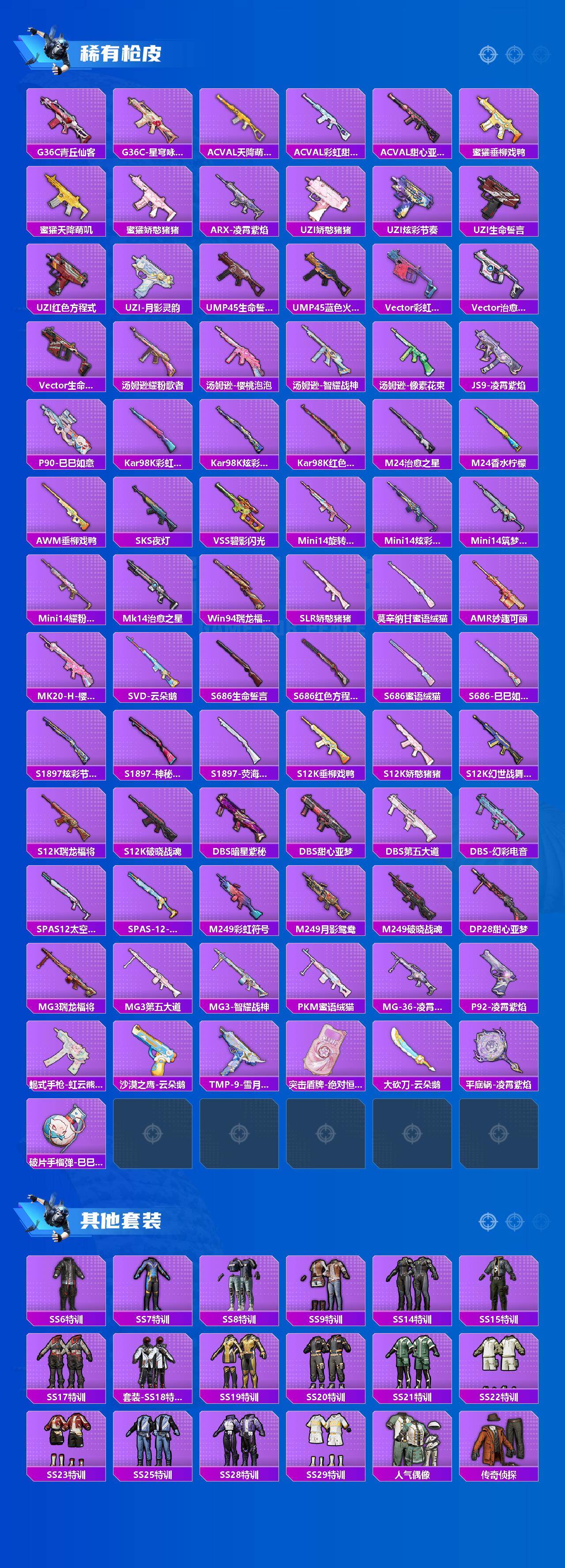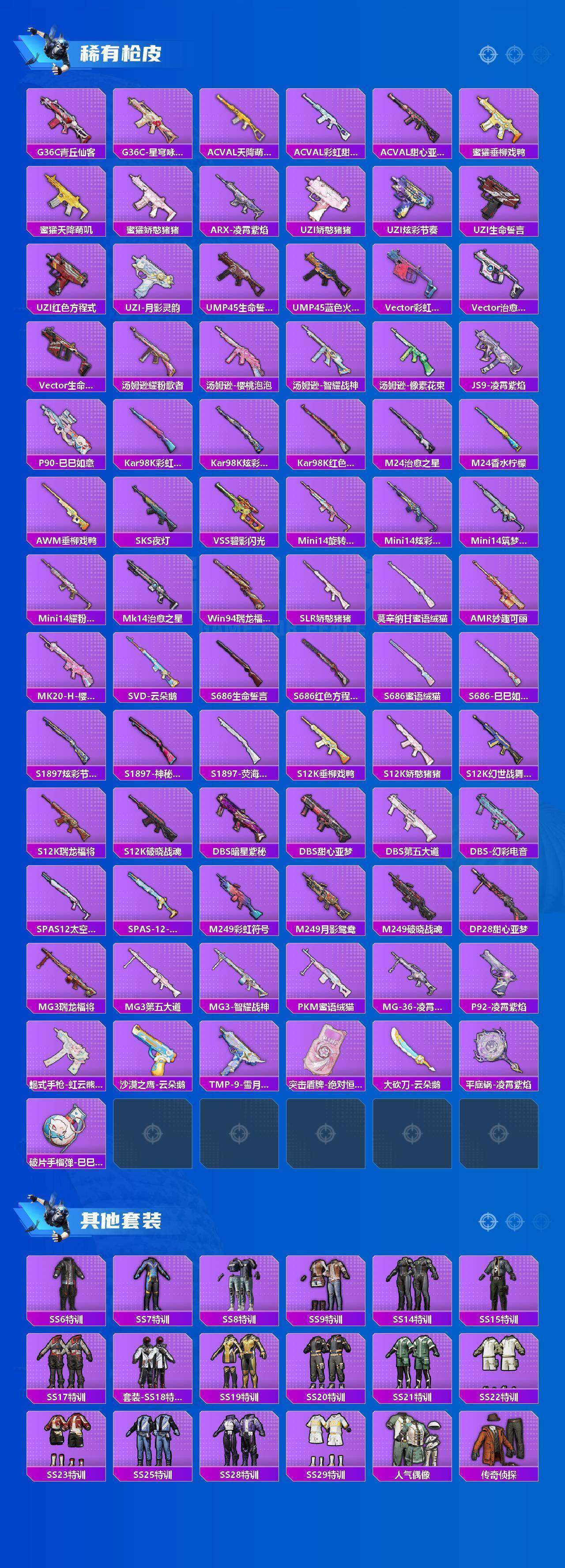 (8粉套7粉枪)暗夜玫瑰/庄周梦蝶/太空嘟嘟/千面幻镜/旋转彩虹/蜜语绒猫/千金淑猫/荧海星豚/M16A4垂柳戏鸭七级/AKS74U星穹咏叹调七级/Kar98K巳巳如意五级/Mk14福马献瑞五级/M417第五大道七级/DP28豹影疾电五级/PKM守护天翼七级/没战神框/HP7843-1粉色飞行器-62115热力值-16王牌印记-144套装-187枪皮