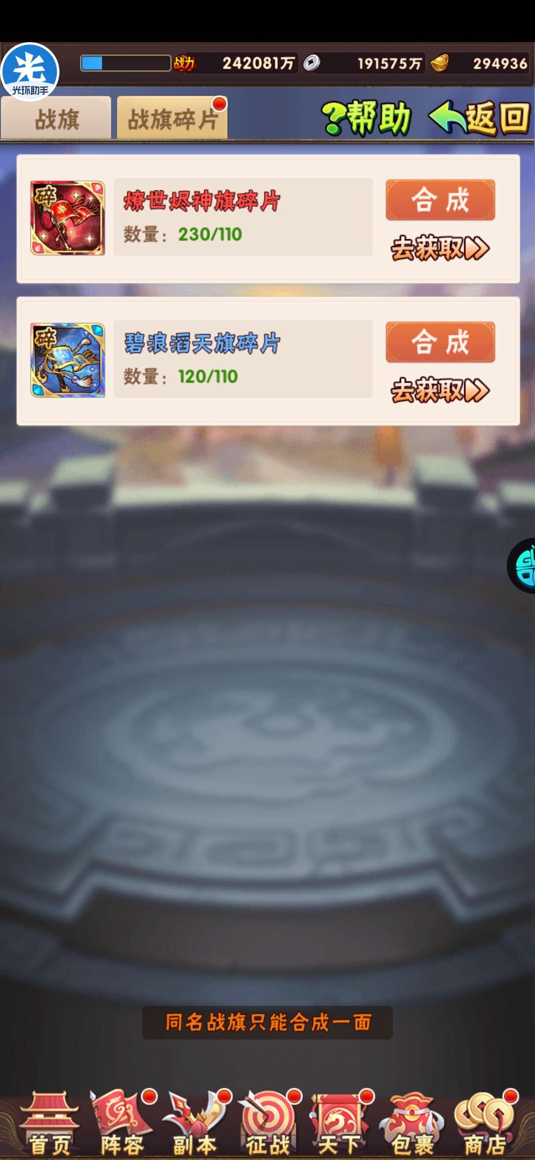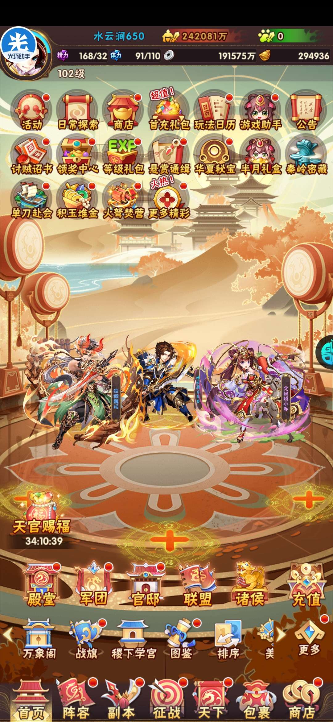 签到币11万+,可换大量资源;魂金装备4件套。,⌛魂金兵符全跟进,6兵符:魂金双昊金双兵符+幻金双兵符;双丹7万;额度2750左右。⏰初始资源全在:副本一章没打,战力没搞,弄完能获取100万元宝!⏰魂金:武将、战旗、名将、军师、宠物 、马、神兵全可合成,⏰果盘游戏APP下载少年三国志(五个字的版本)