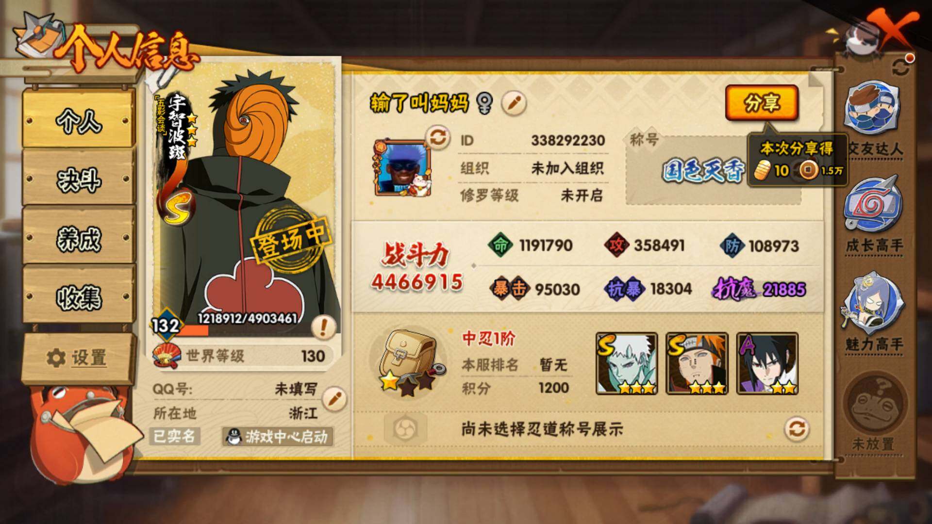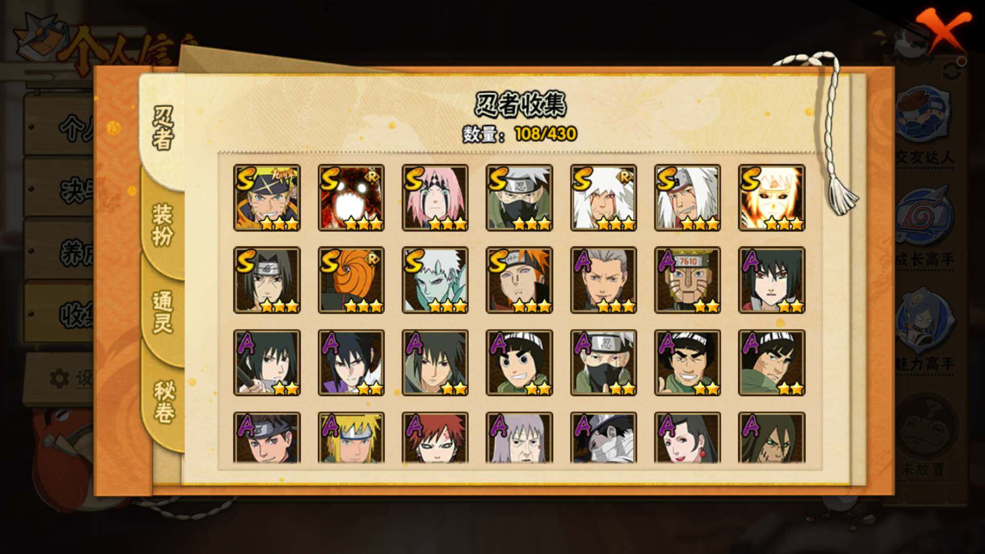 V10 11S 27A 446万战力 4300金币 520点卷 热门A侠隐佐助 漂泊带土 暴怒带土。S碎片神驹斑50片 舍人90片。YY1990