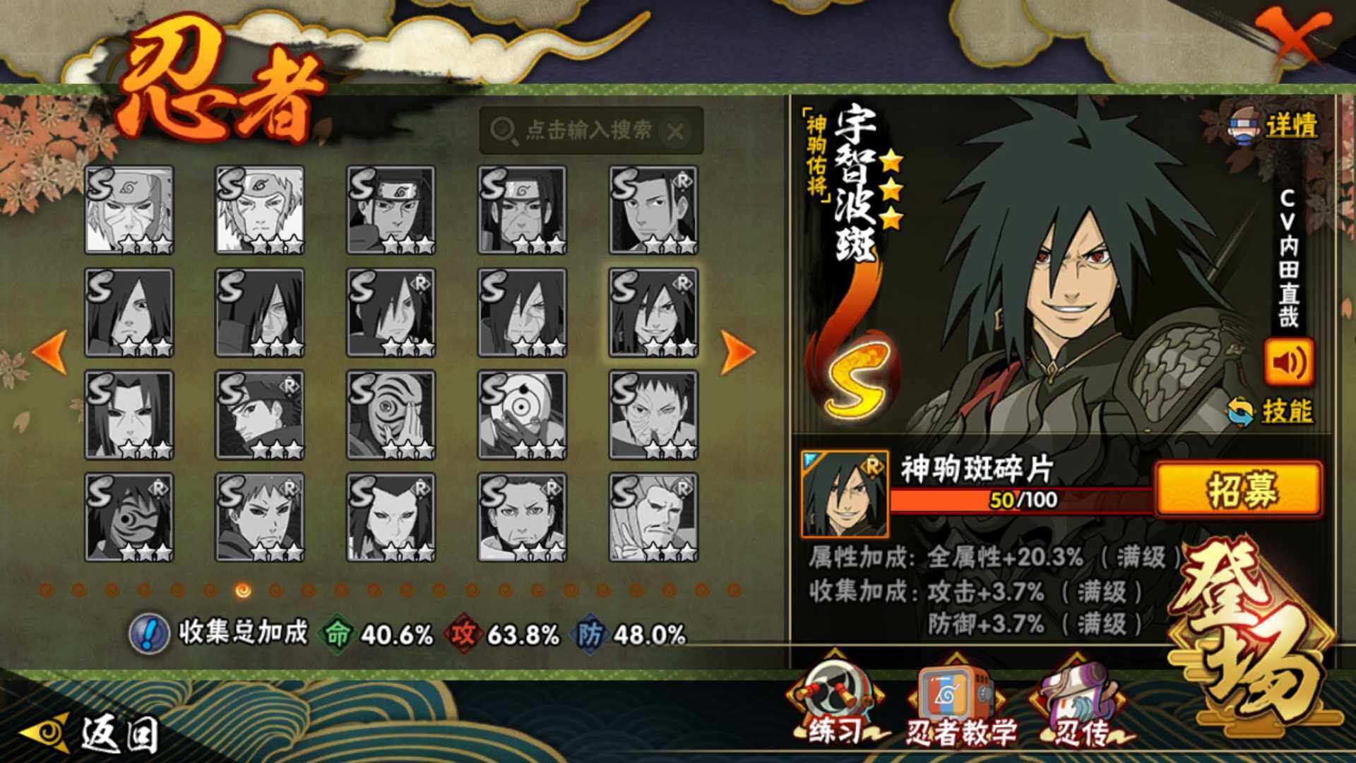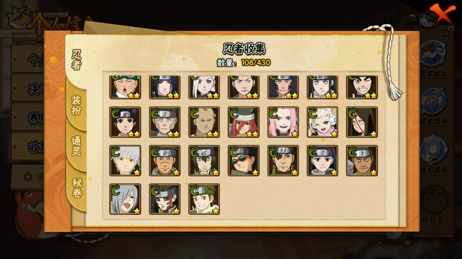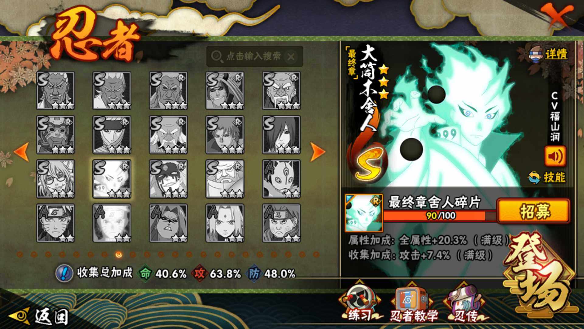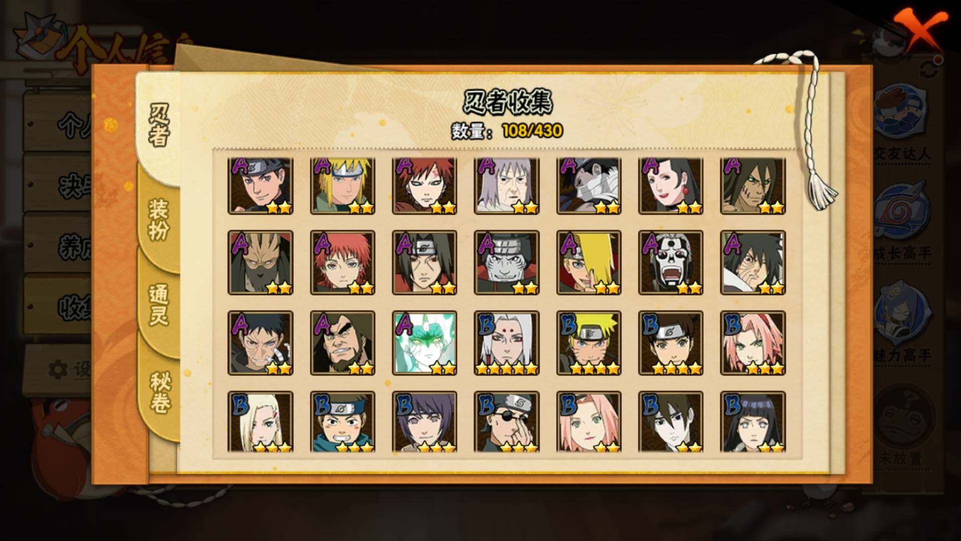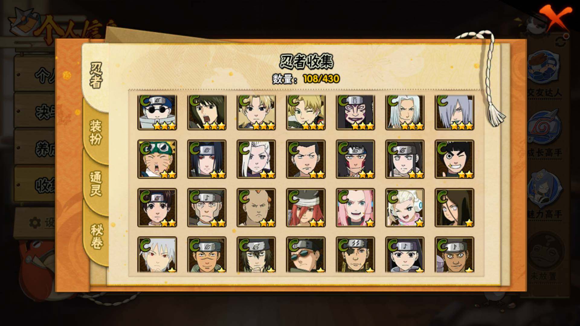 【S级忍者】:春野樱「忍界大战」(3星),宇智波鼬「须佐能乎」(3星),旗木卡卡西「须佐能乎」(3星),自来也「舞之豪杰」(3星),自来也「传说中的三忍」(3星),佩恩「天道」(3星),漩涡鸣人「暴怒·第六尾」(3星),波风水门「九喇嘛连结」(3星),