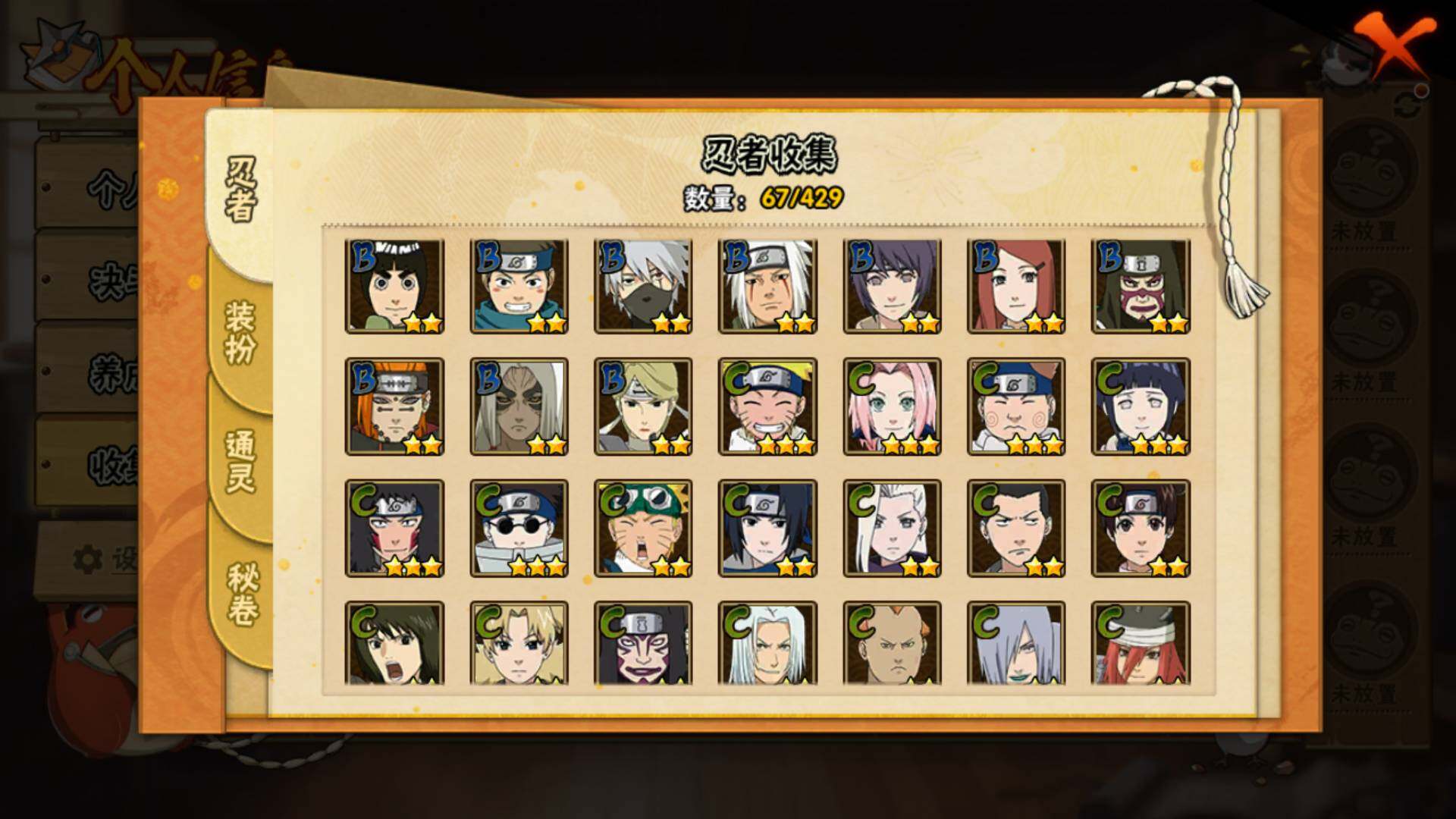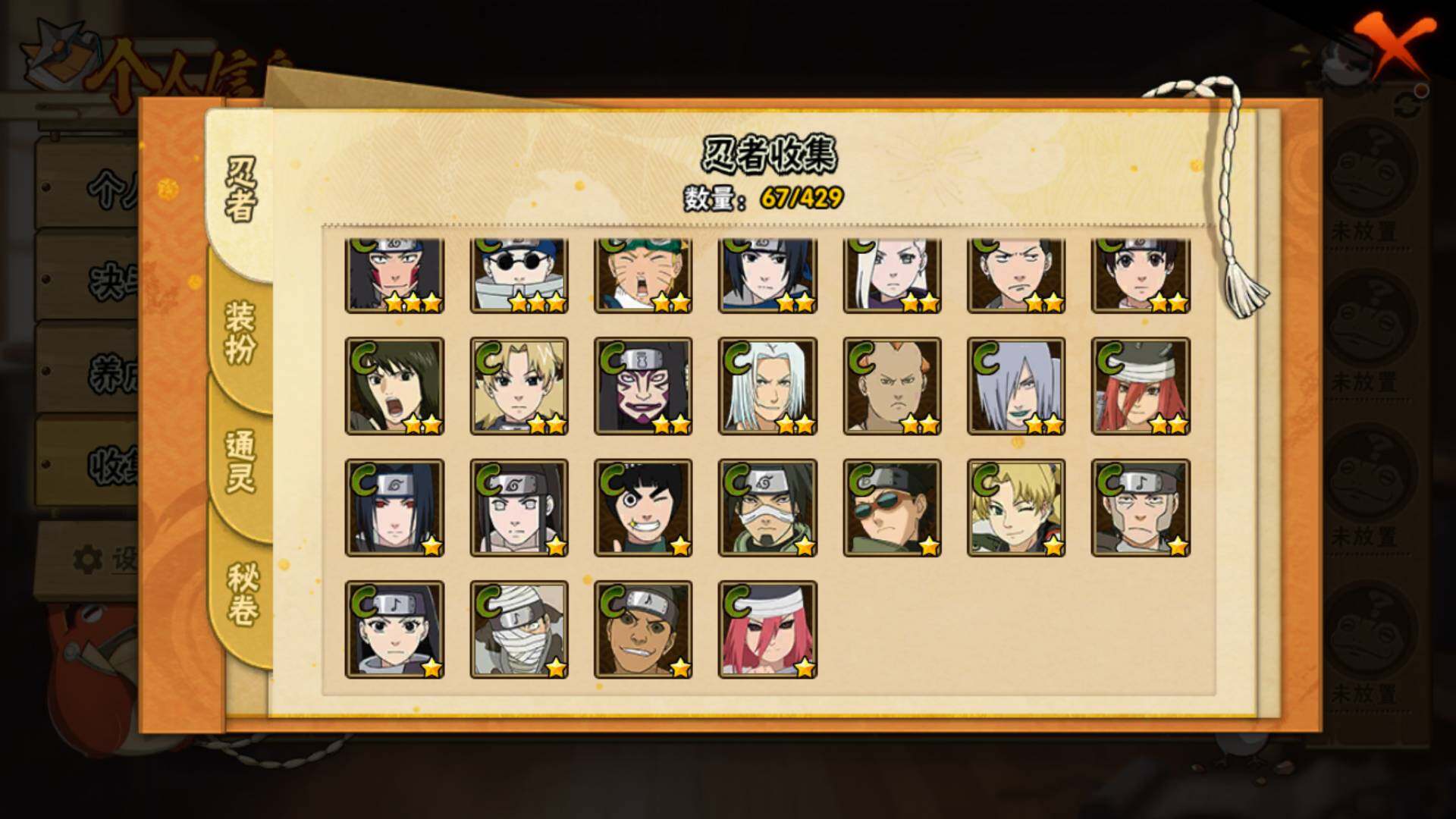 【S级忍者】:宇智波鼬「须佐能乎」(3星),自来也「舞之豪杰」(3星),波风水门「九喇嘛连结」(3星),漩涡鸣人·宇智波佐助(3星),宇智波带土「十尾人柱力」(3星)