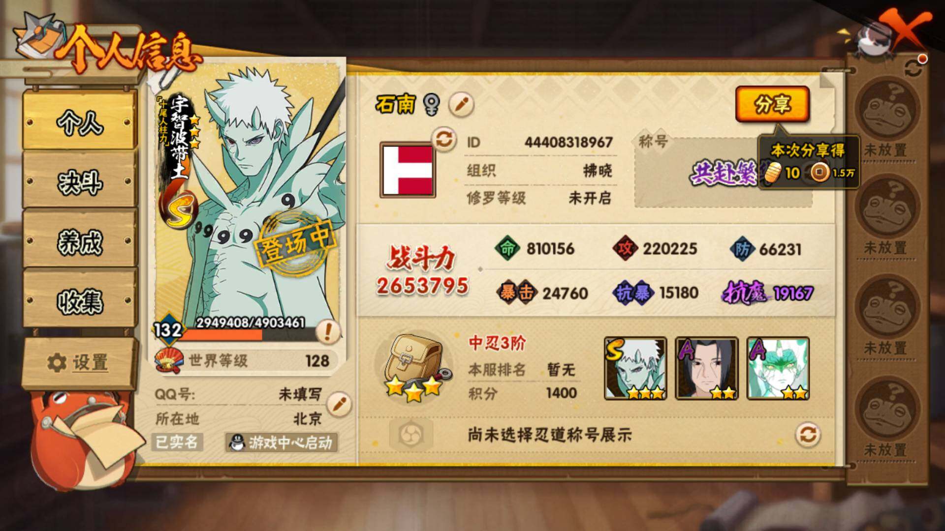 (可免费转苹果)v6,265w战力,5S级忍者数-12A级忍者数,热门A夏日鼬