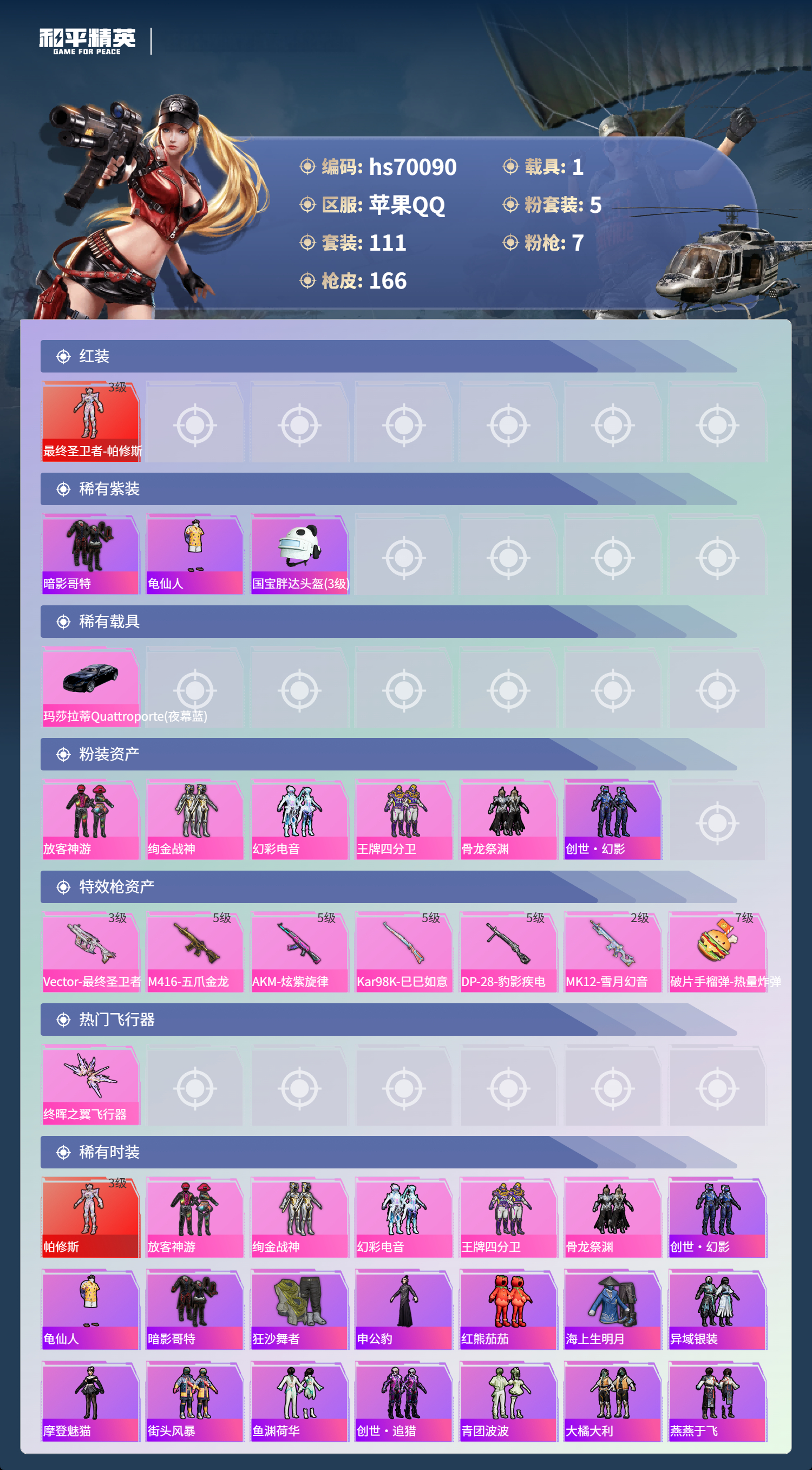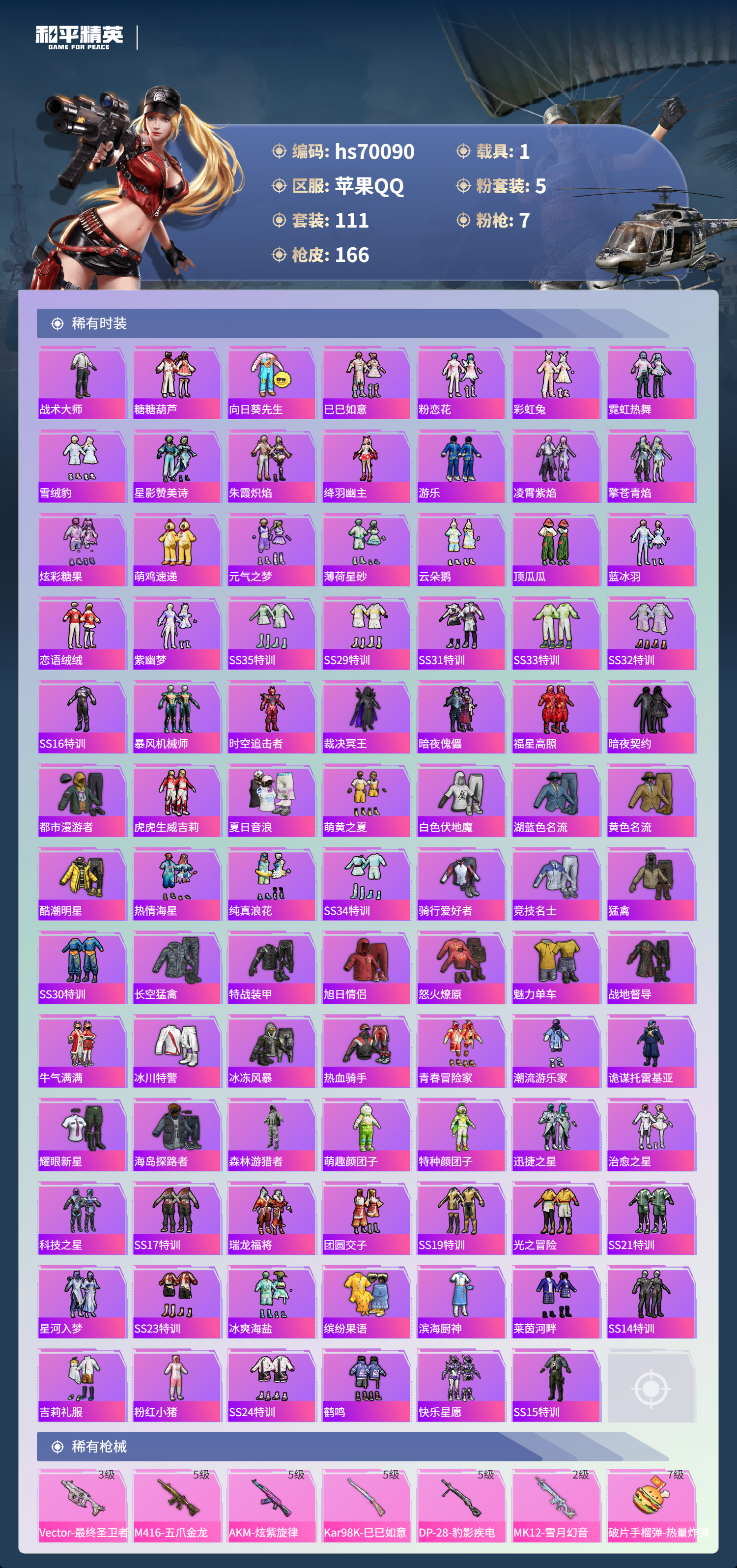 hs70090 苹果手Q-10王牌印记-有战神框-1红装-5粉装-7特效枪-1载具-55371热力值-111套装-166枪皮-5卓越印记-5传奇印记