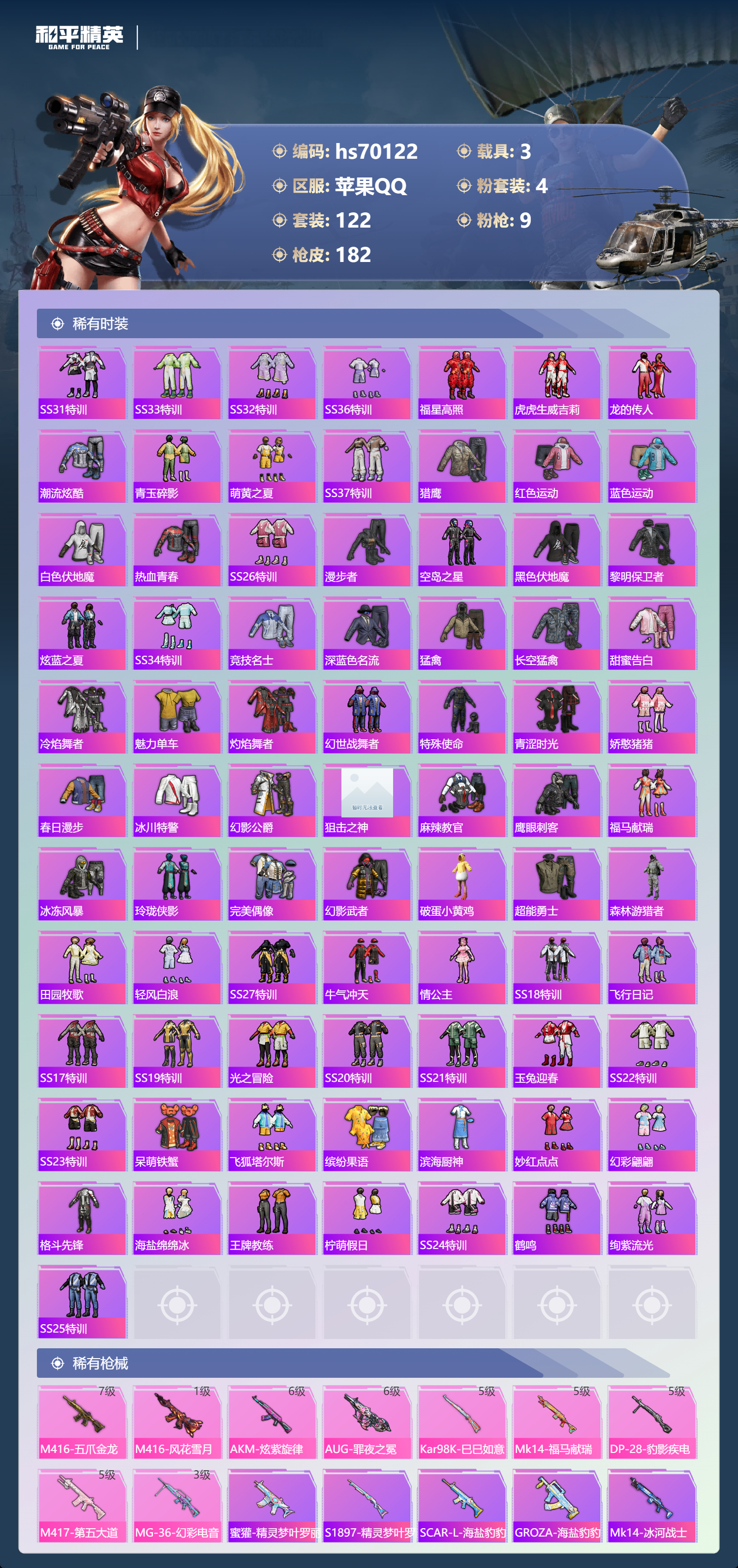 hs70122 苹果手Q-12王牌印记-4粉装-9特效枪-3载具-56106热力值-122套装-182枪皮