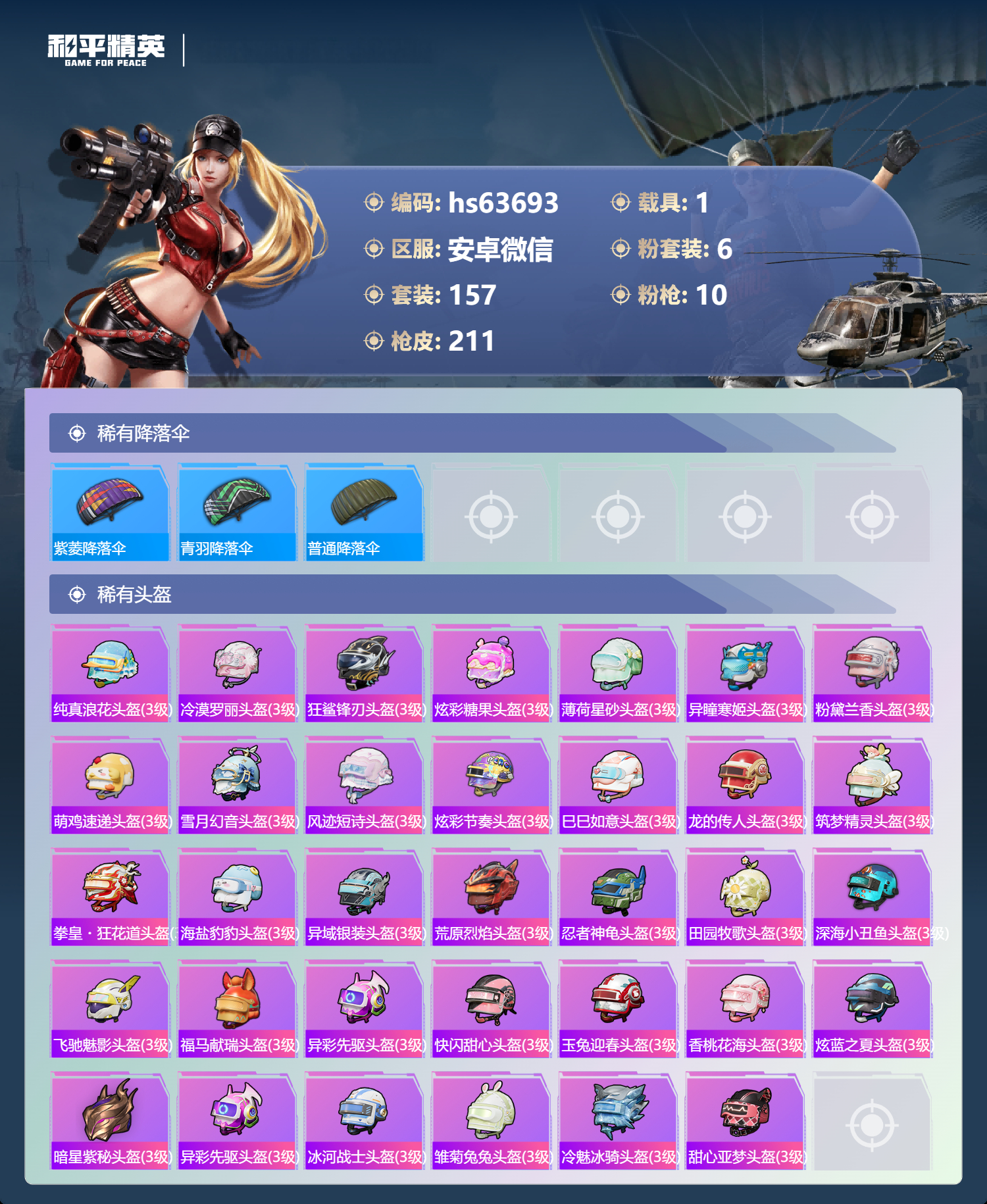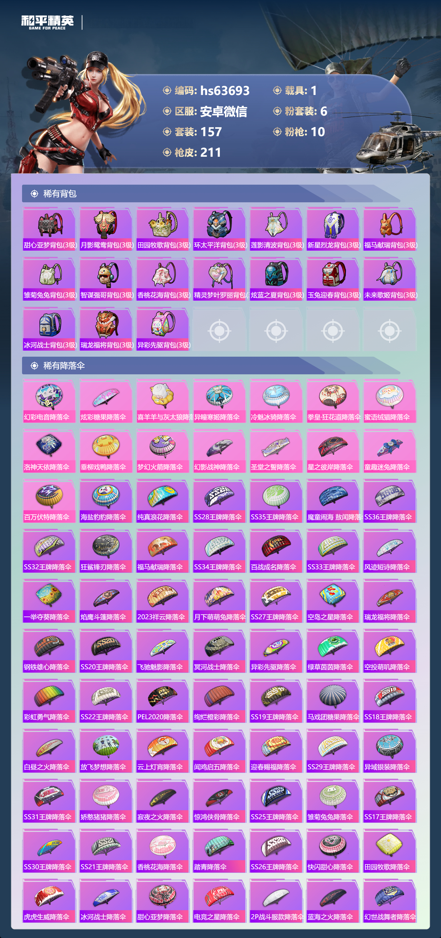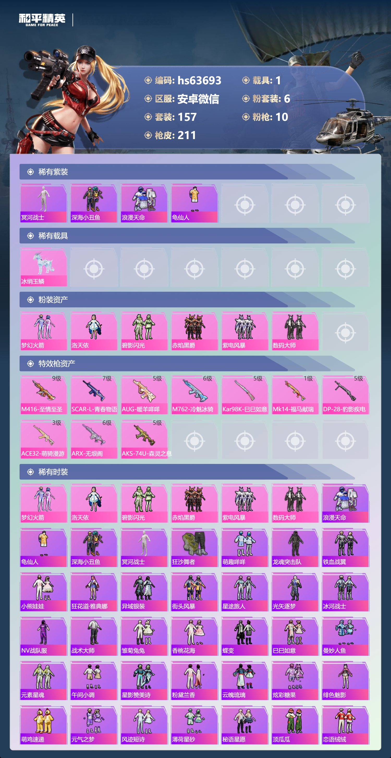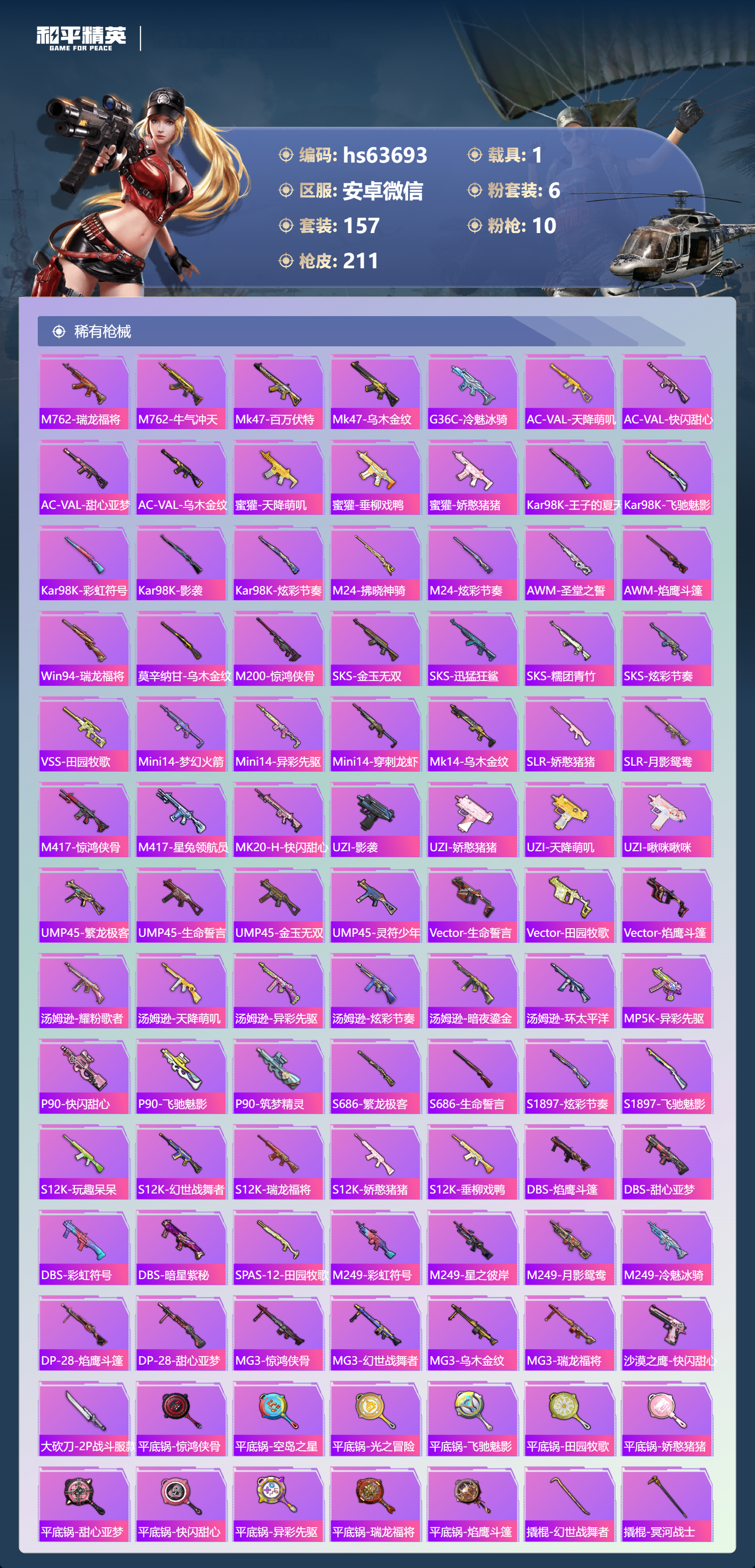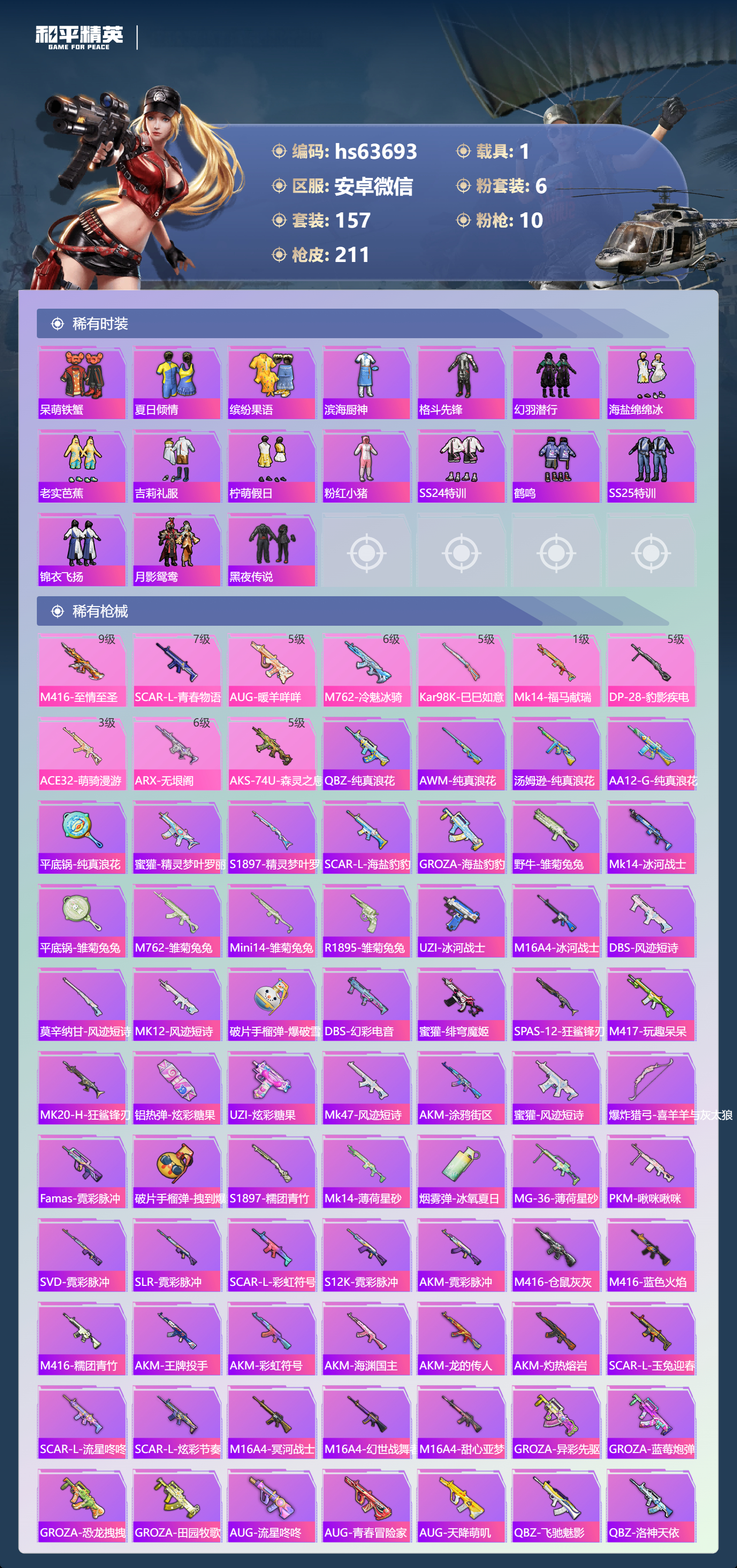 hs63693 安卓微信-19王牌印记-6粉装-10特效枪-1载具-71372热力值-157套装-211枪皮-3卓越印记-1传奇印记