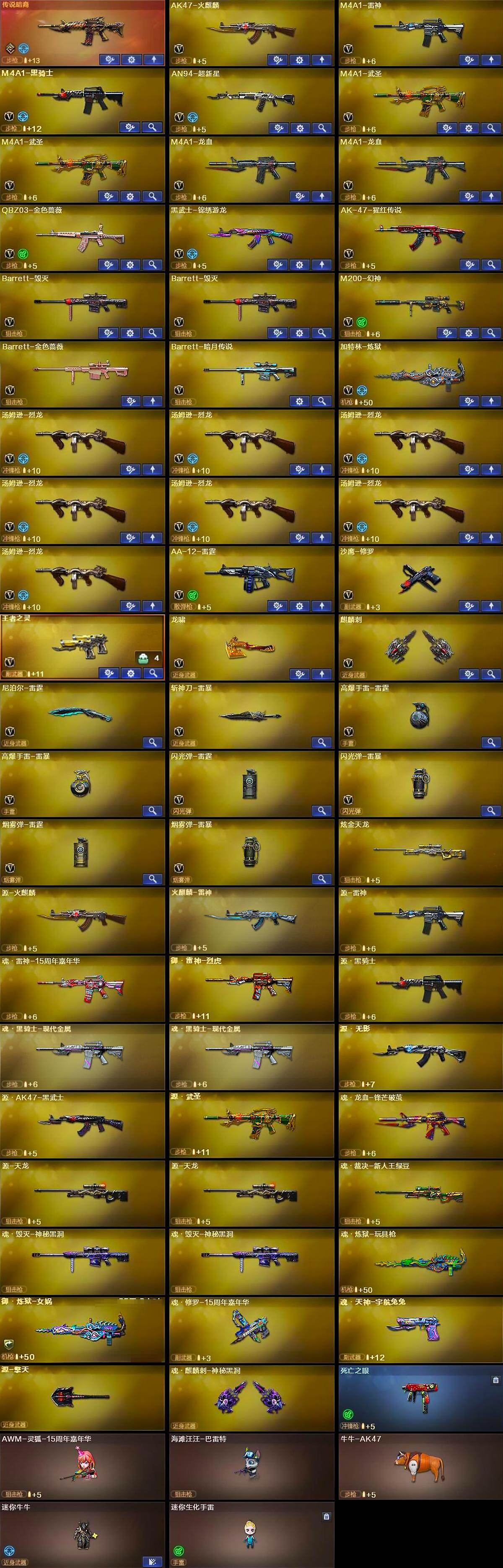 【热门武器】:传说暗裔,QBZ03-金色蔷薇,M200-幻神,死亡之眼,牛牛-AK47,M4A1-黑骑士,汤姆逊-烈龙*7,加特林-炼狱,沙鹰-修罗