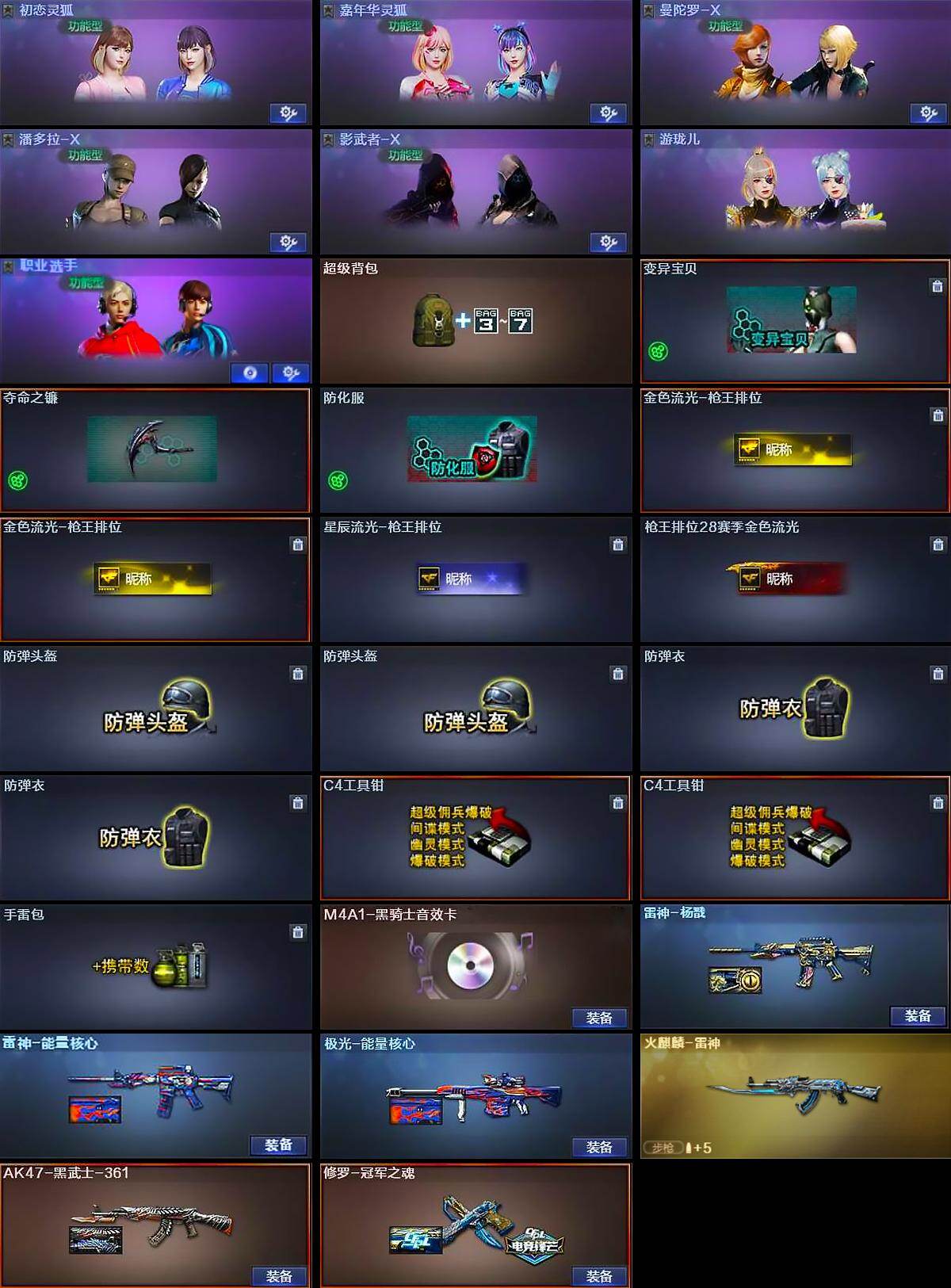 【皮肤】:雷神-能量核心,雷神-杨戬,火麒麟-雷神,AK47-黑武士-361,极光-能量核心,修罗-冠军之魂