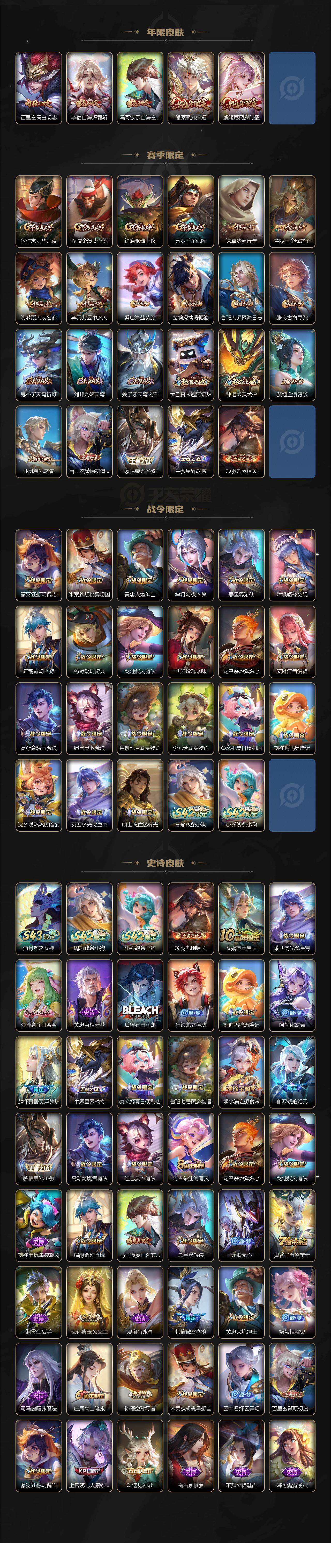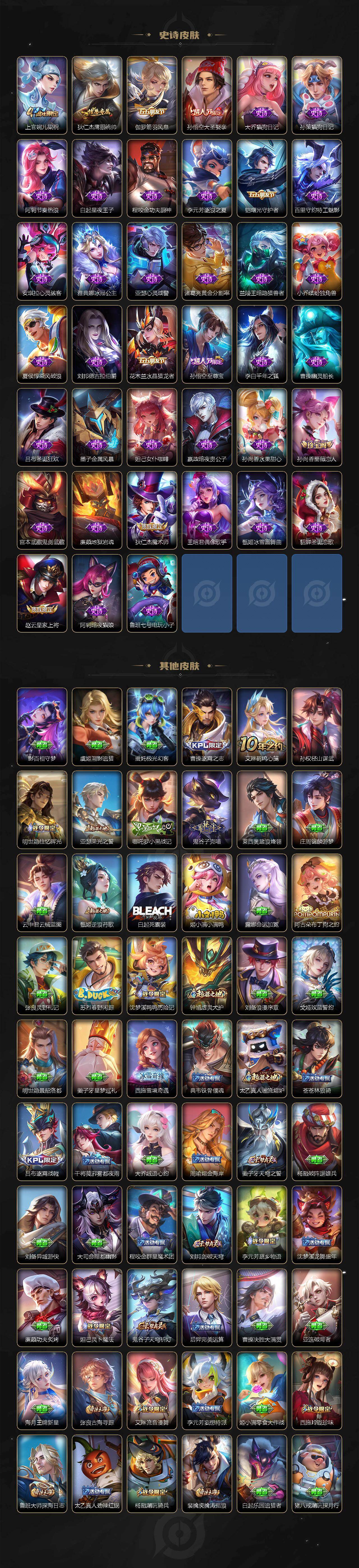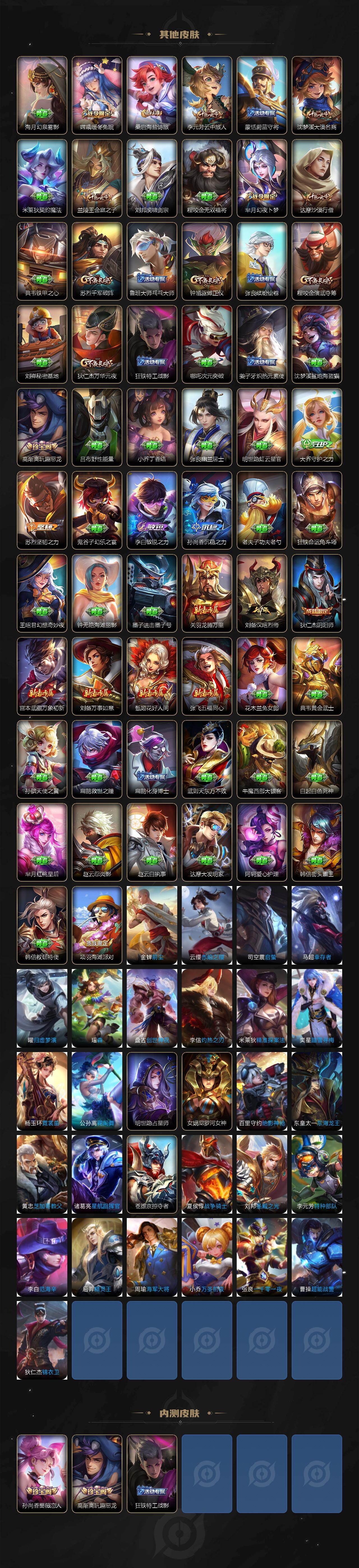 【传说皮肤】:马超神骥逐星野,澜愿照九州拓,虞姬愿照岁时盈,吕布曦玄引,花木兰燃星之曲,李信山海炽霜斩,马超无双飞将,王昭君乞巧织情,曜云鹰飞将,李信一念神魔,貂蝉猫影幻舞,干将莫邪久胜战神,达摩黄金狮子座,百里玄策白虎志,花木兰冠军飞将,后羿黄金射手座,宫本武藏地狱之眼,孙悟空地狱火