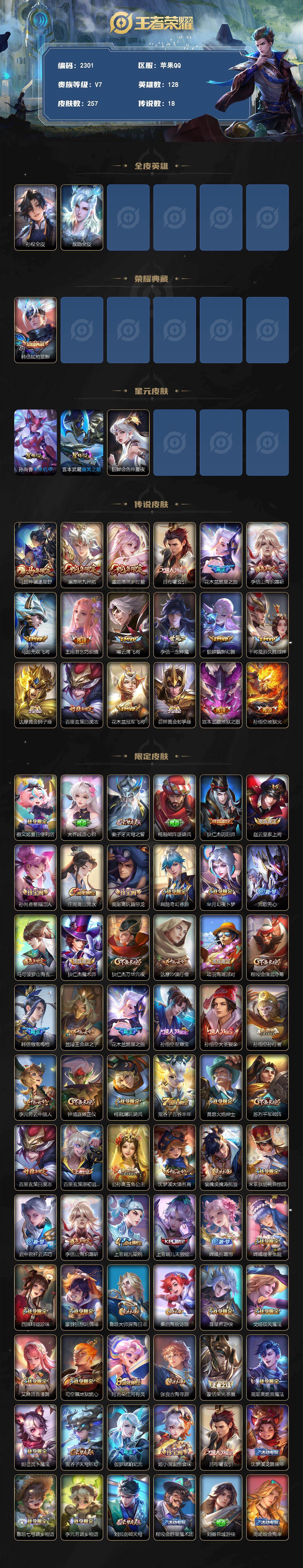 苹果Q-V7-至尊星耀I段位-128英雄-257皮肤-1典藏皮肤-18传说-84史诗