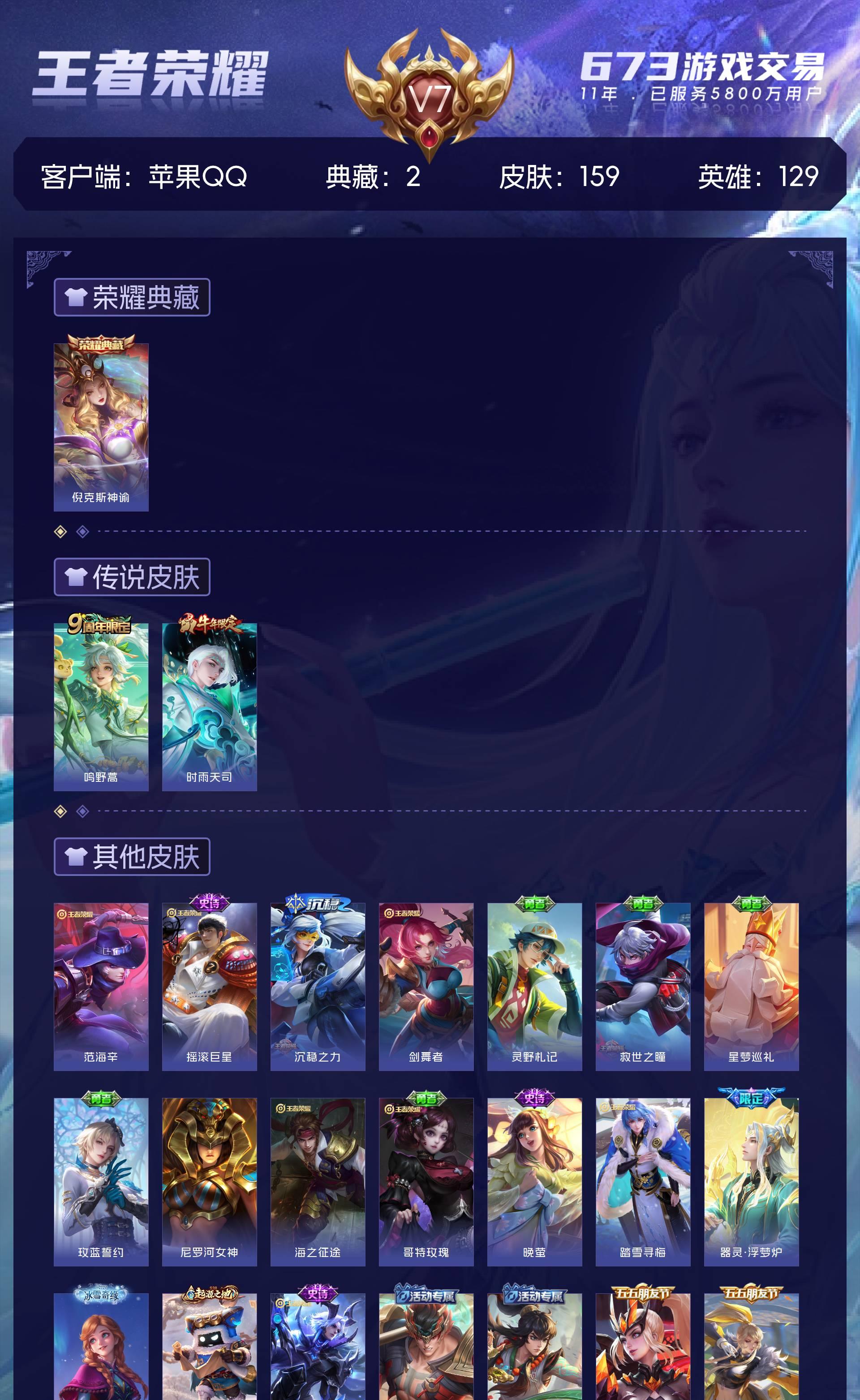 V7 皮肤159 英雄129 最强王者 荣耀典藏2 传说2